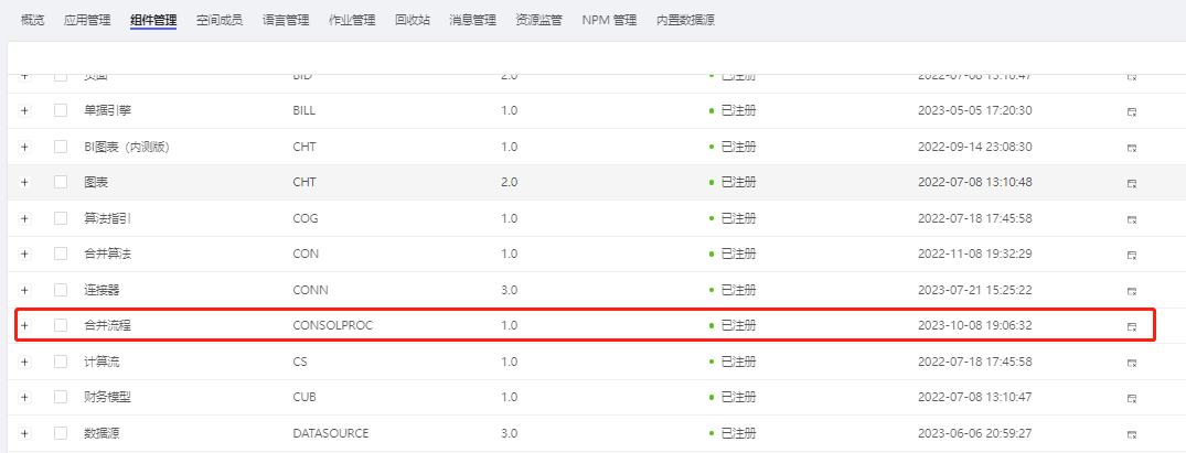 在使用【合并流程】组件前,先要确保我们使用的空间已经注册了【合并流程】组件