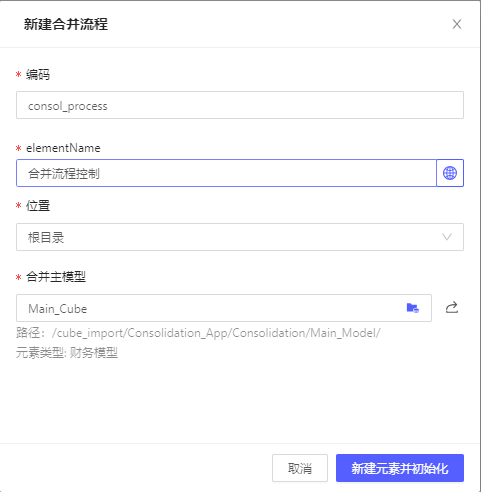 元素其他信息不再做解释说明,合并主模型通常为合并财务模型Main_cube,需要注意的是目前关联财务模型初始化后,不可修改。