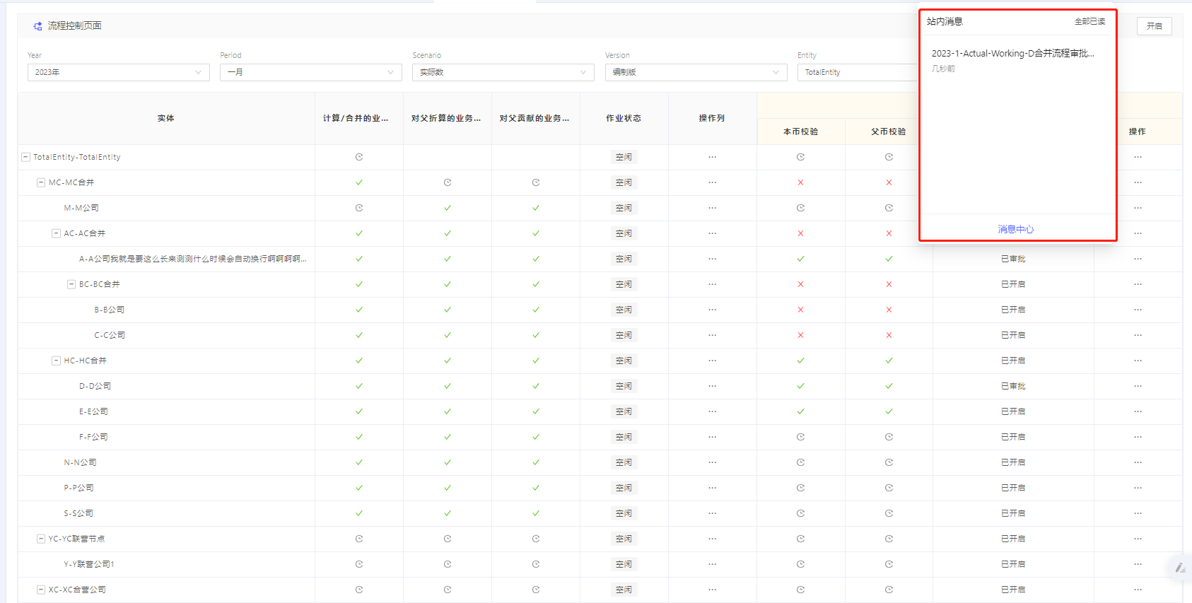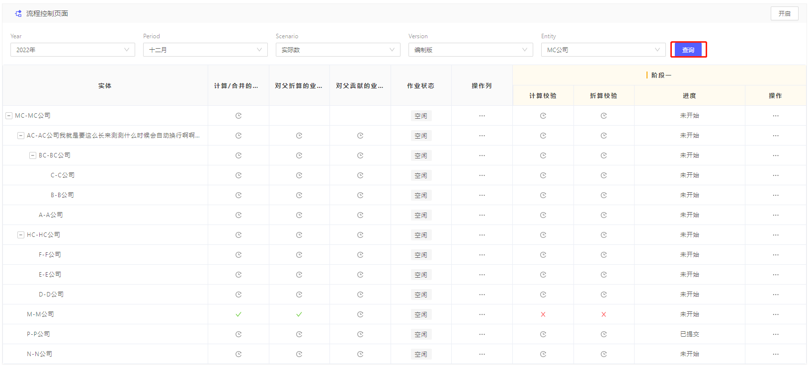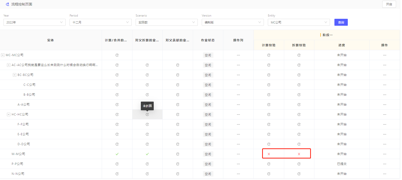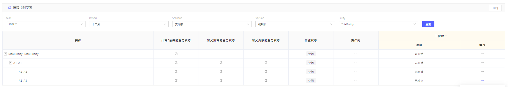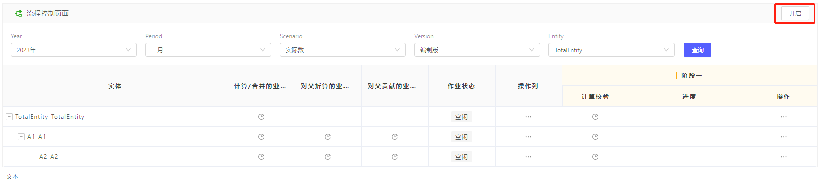 如查询的实体未开启,所有合并动作包括审批是无法操作的,包括合并计算、阶段审批等,对应数据都会展示NotStarted