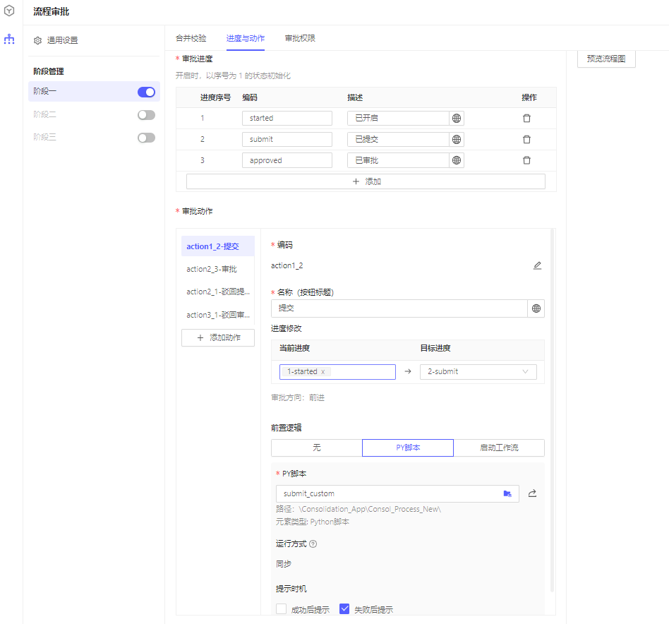 审批动作执行的主要逻辑是根据编辑视图的配置,分阶段将进度修改至目标进度。
