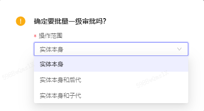 Ⅰ.当操作按钮打开「允许对实体后代操作」时,审批时会弹窗二次确认,需确认操作范围,目前只支持: