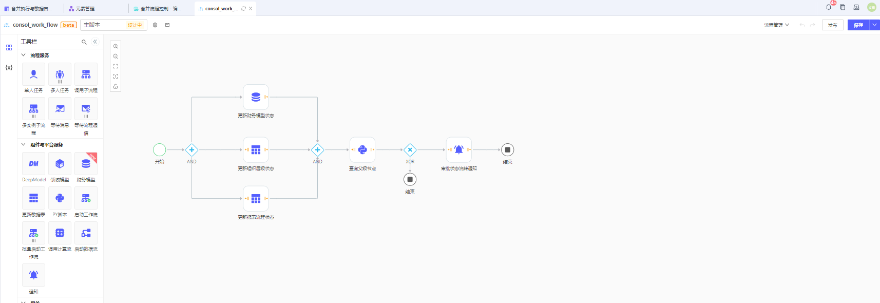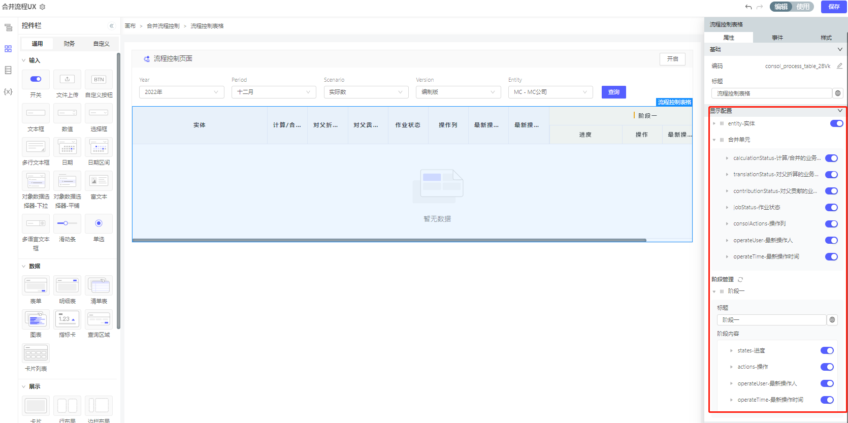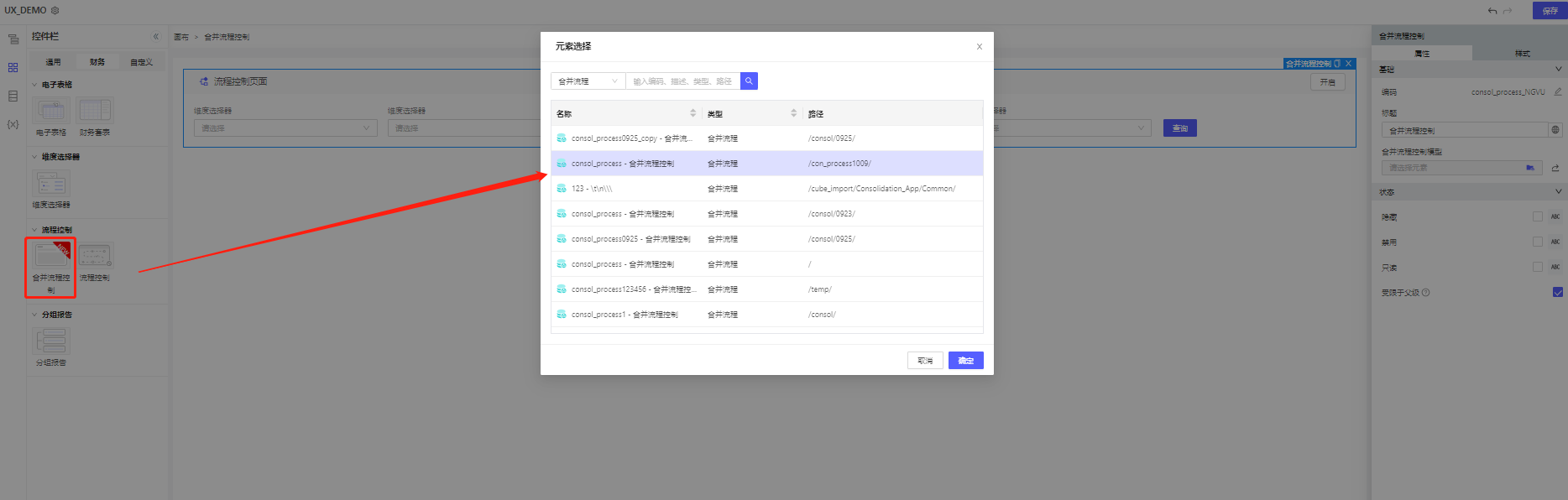 新建UX元素,选择【控件栏】-【财务】-【合并流程控制】,拖入到画布