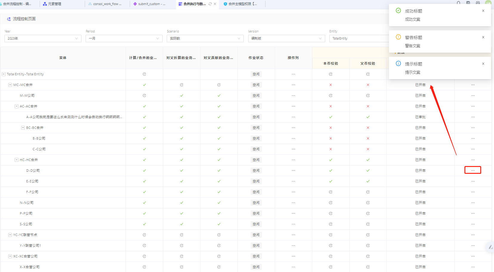 按流程单元点击合并动作按钮,系统将按配置的PY脚本进行合并计算、折算、贡献(抵消)等合并计算。