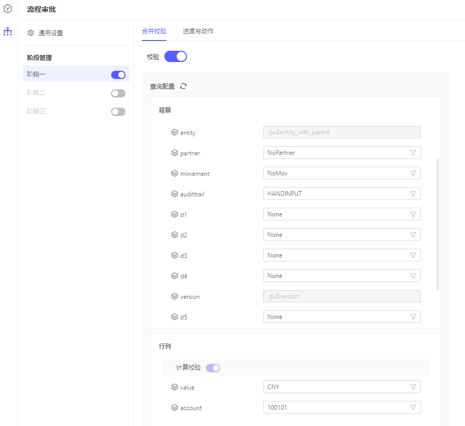阶段信息展示编辑态开启的校验类型列,在执行查询时会按编辑态合并校验配置进行动态查询校验,具体校验逻辑可参考4.4审批动作执行-合并校验