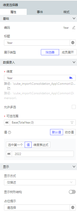 我们可以编辑维度选择器的属性,如维度的选择范围,默认值等;