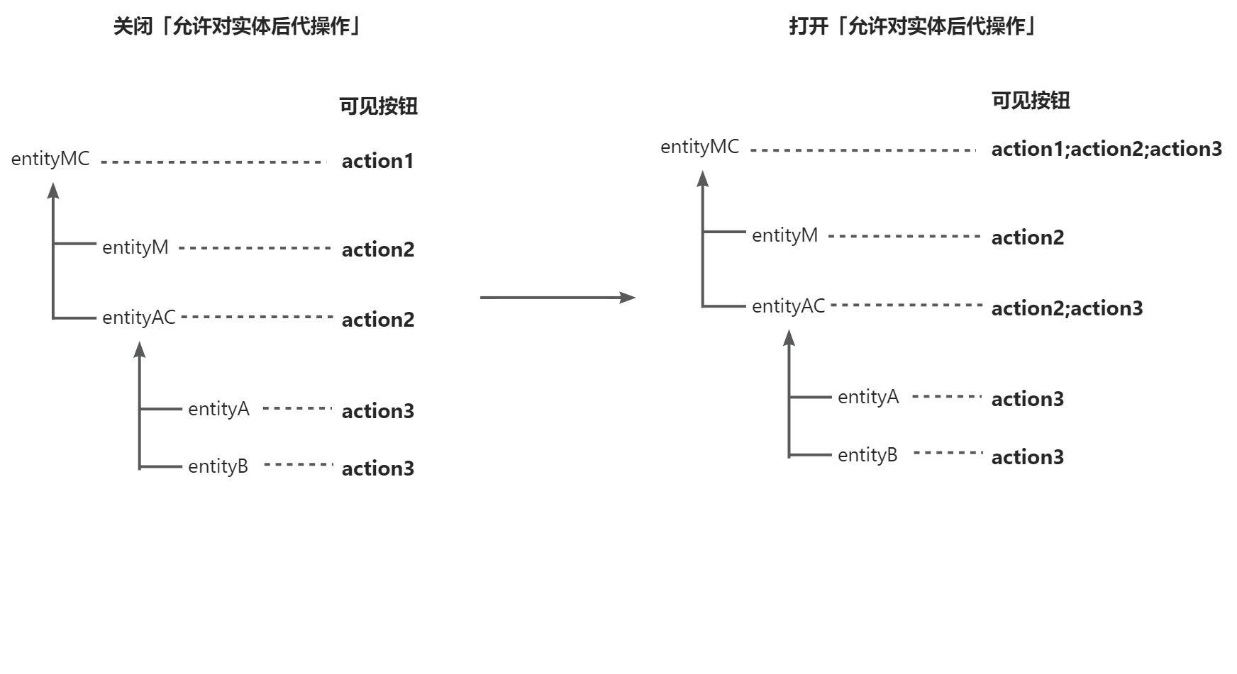 与单条权限不同,单条同行流程单元「当前进度」= 动作配置「当前进度」时具备权限,后代批量按钮在此基础上,合并实体按钮会展现所有后代出现过的按钮,具体可见下案例: