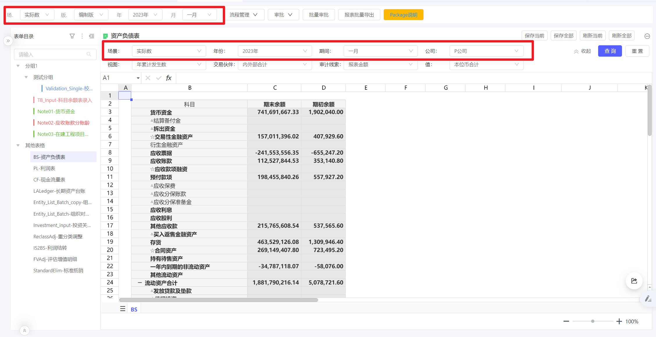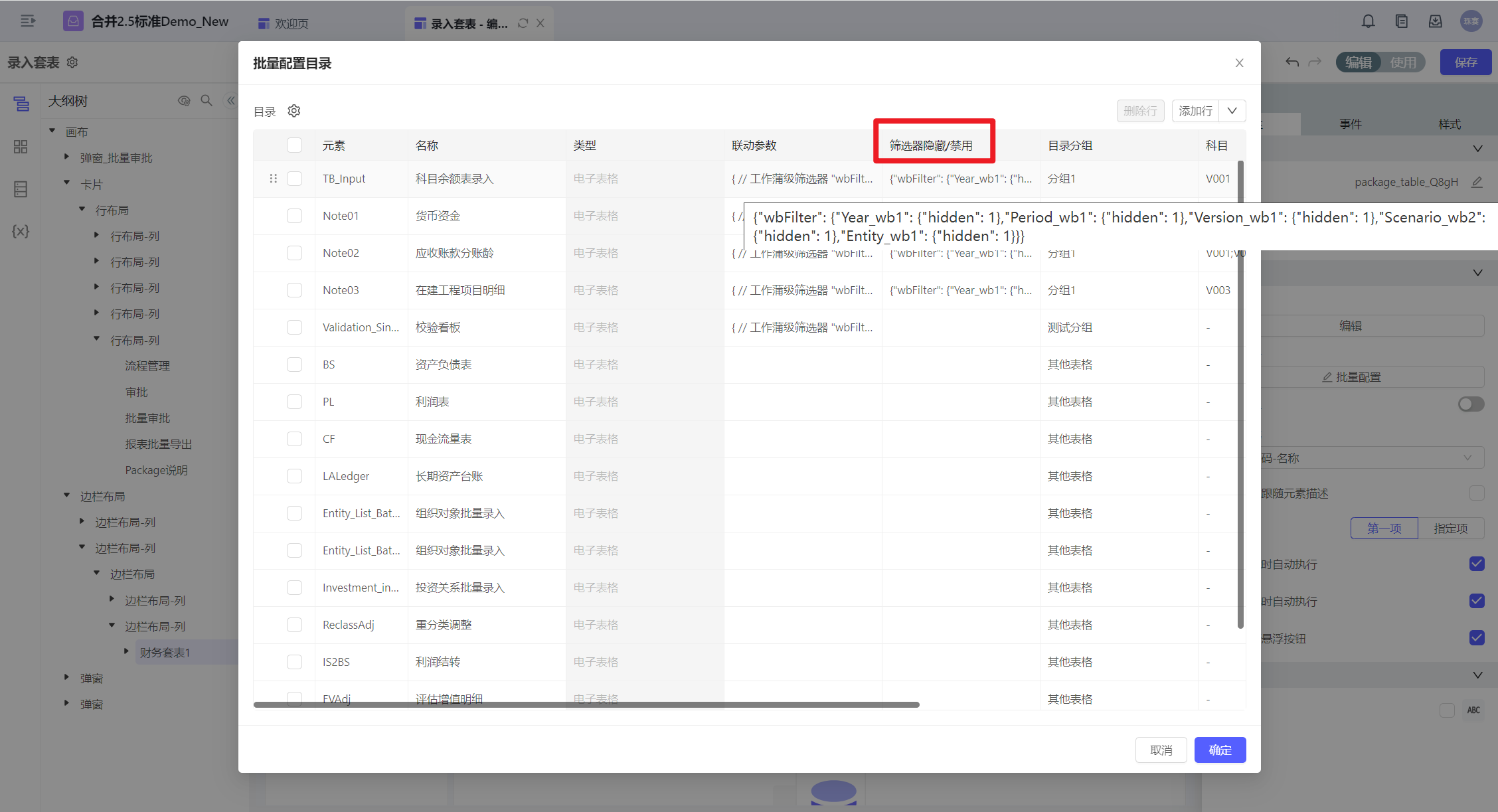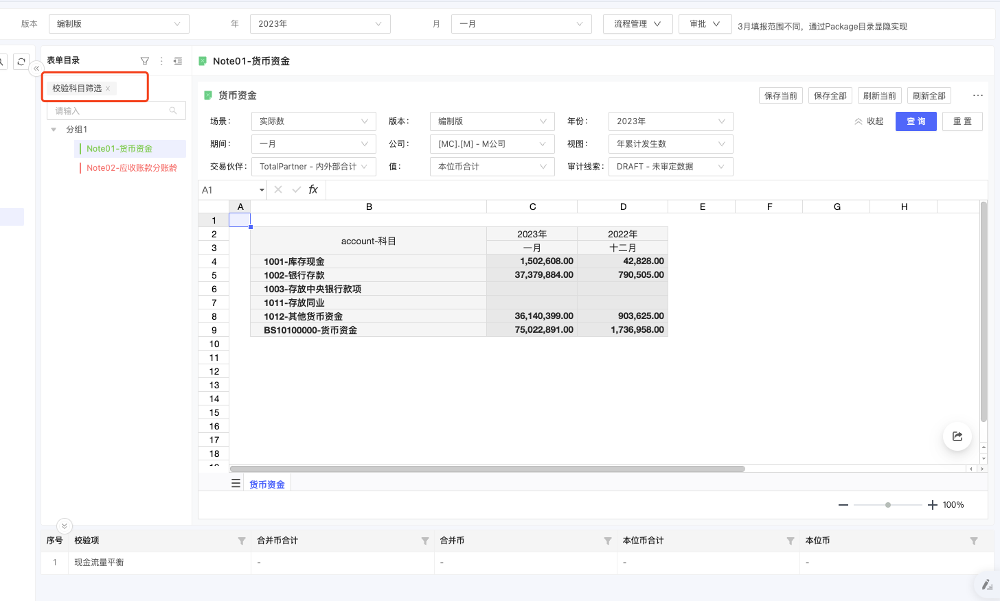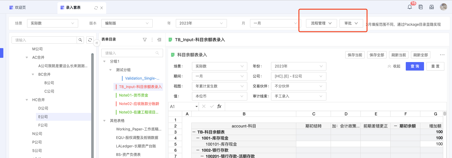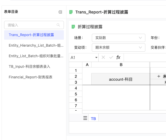 同一个校验科目:例如资产负债表平衡,可能会关联多张表单。为了便于在标准校验看板中,点击对应科目能够查询到相关的所有表单,增加套表的自定义筛选动作。通过将点击校验看板时的科目传递给套表,来实现筛选。