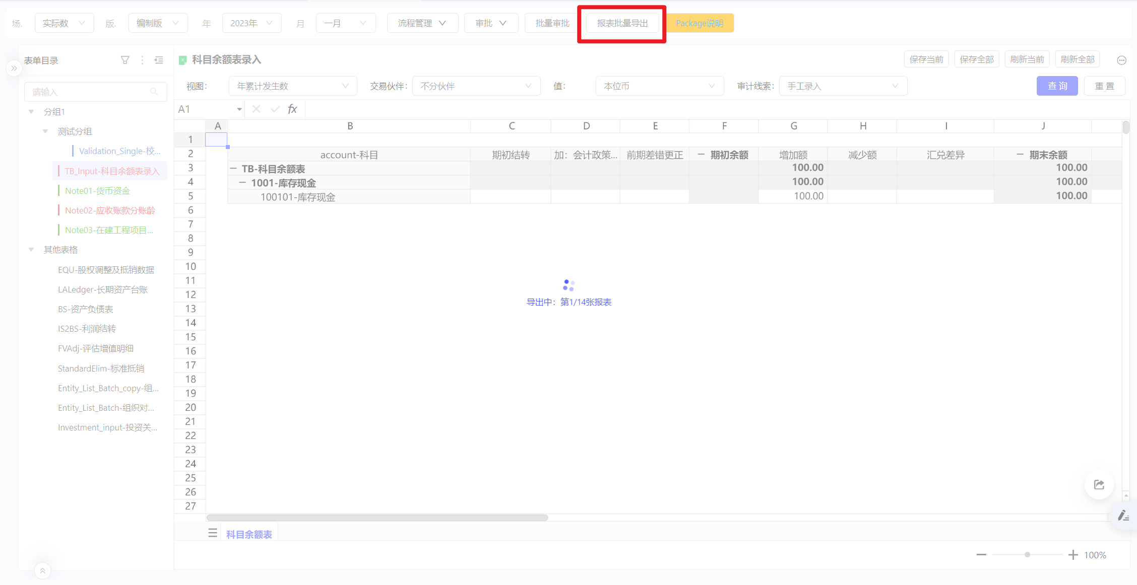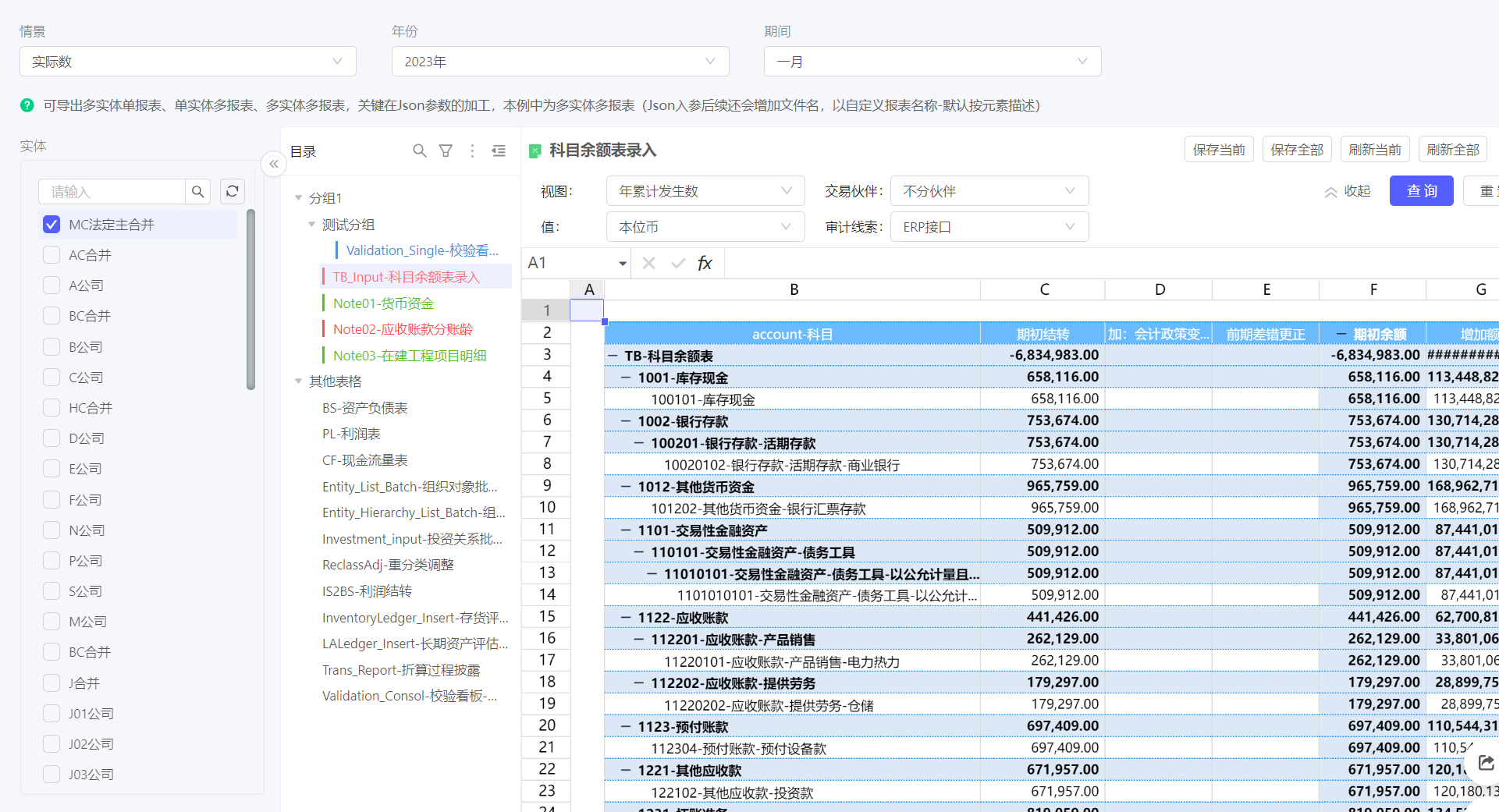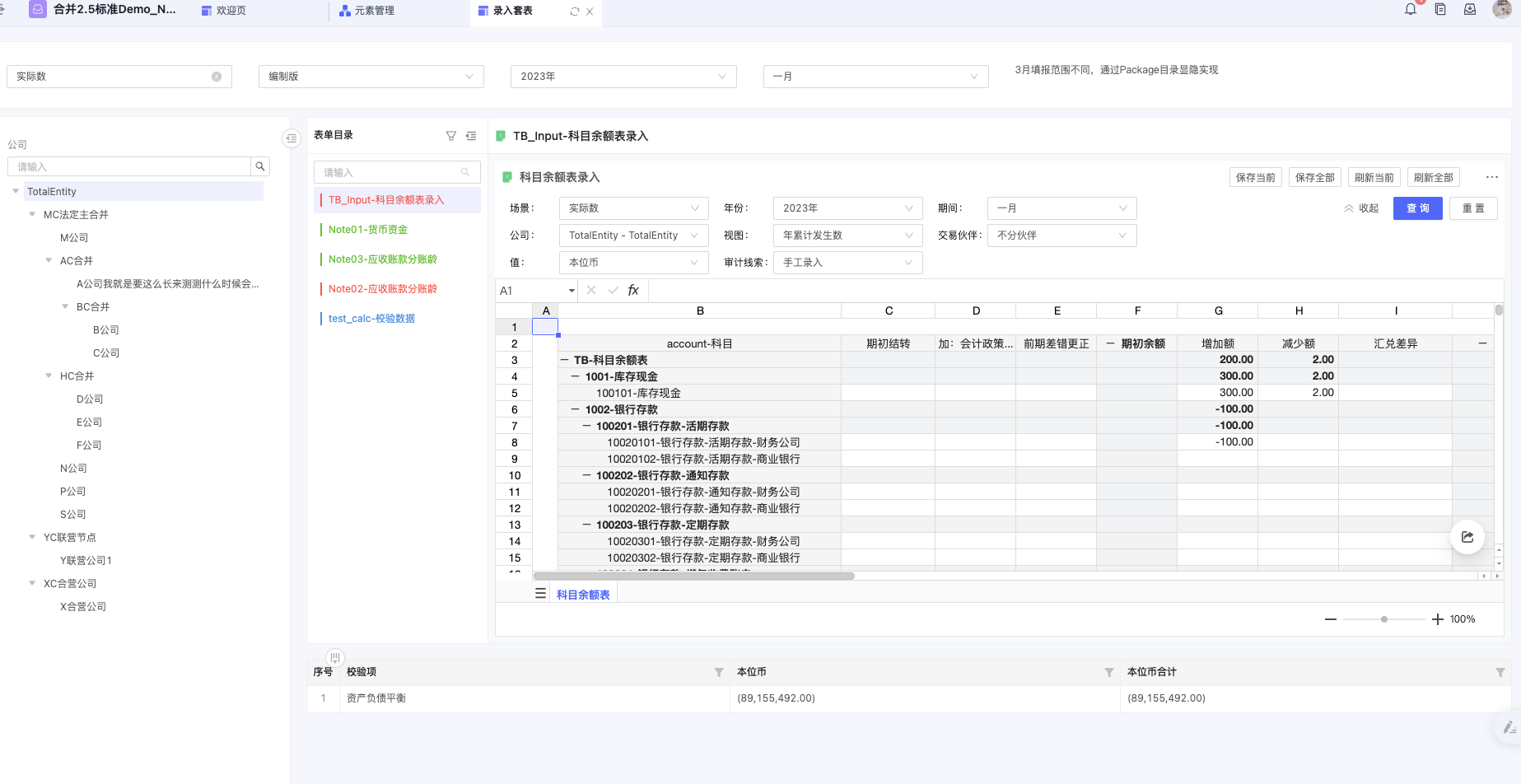同一个校验科目:例如资产负债表平衡,可能会关联多张表单。为了便于在标准校验看板中,点击对应科目能够查询到相关的所有表单,增加套表的自定义筛选动作。通过将点击校验看板时的科目传递给套表,来实现筛选。