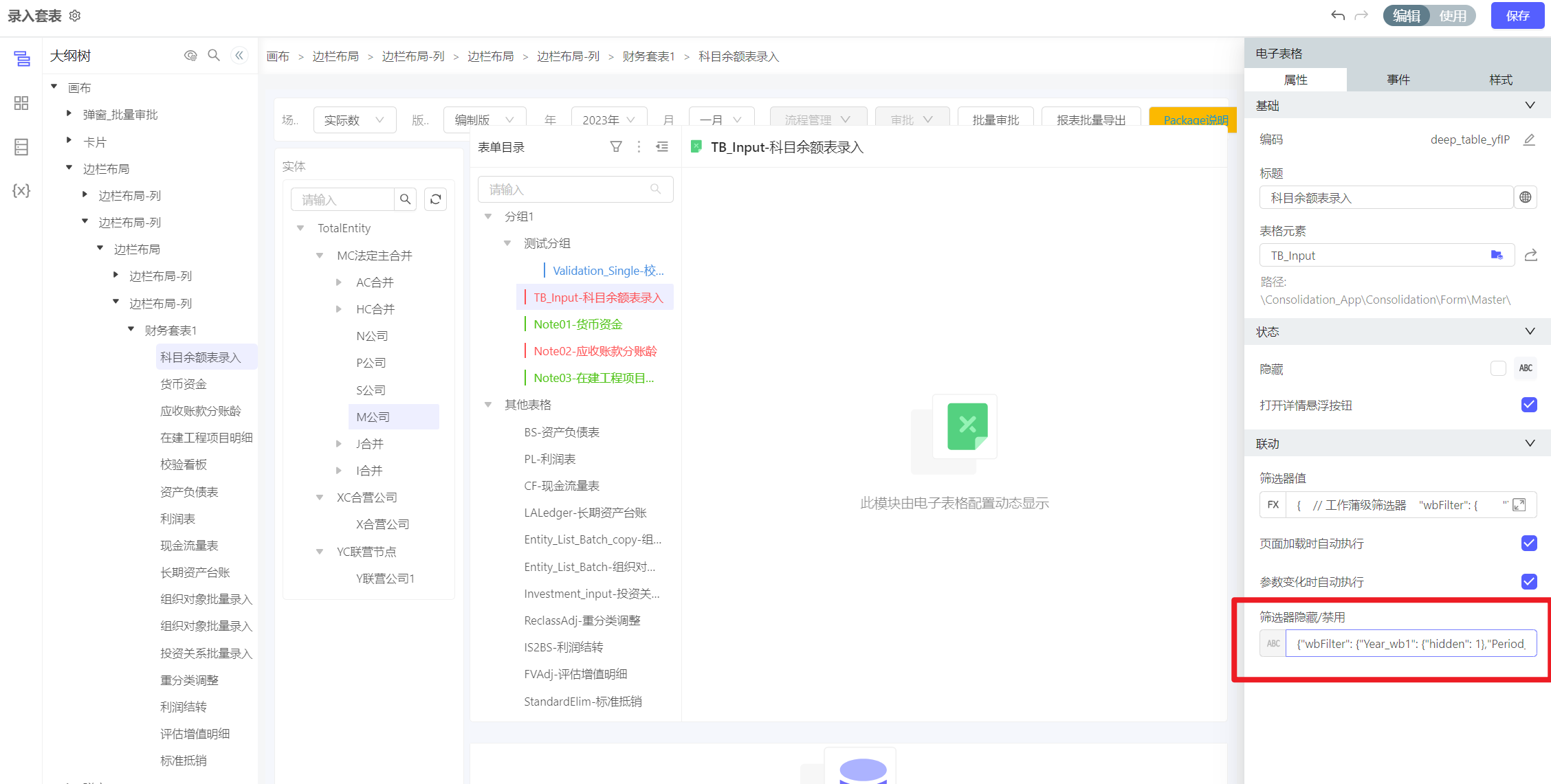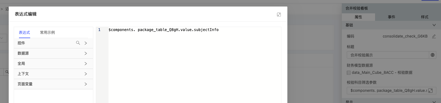 3、(自动)拖出校验看板,选择刚才配置好的数据源。配置入参,注意把package_xxx改成当前财务套表的,用于在点击套表目录时获取点击所对应的科目(如果此处不放校验看板,通过定开或者放电子表格等其他途径实现,也可以通过这种表达式来获取到配置的目录和校验科目的映射关系)