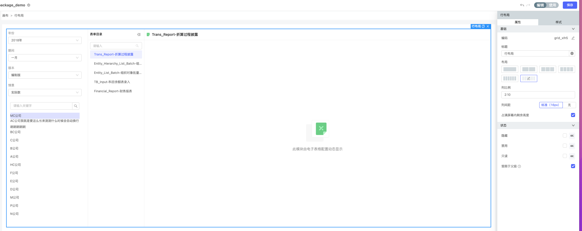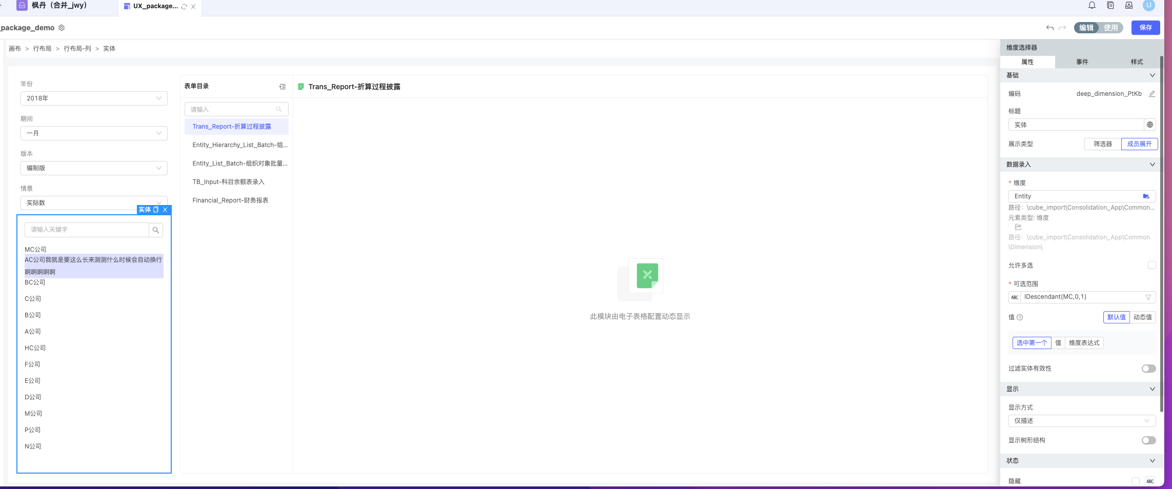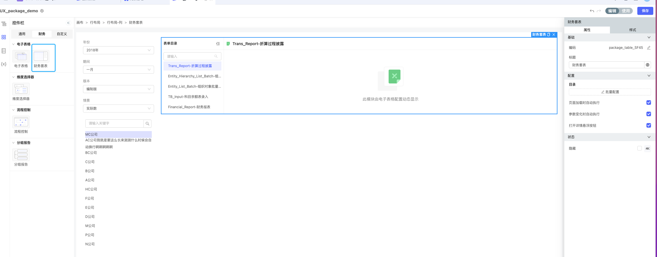 通过UX的布局+维度筛选器+财务套表控件实现老的package的效果。