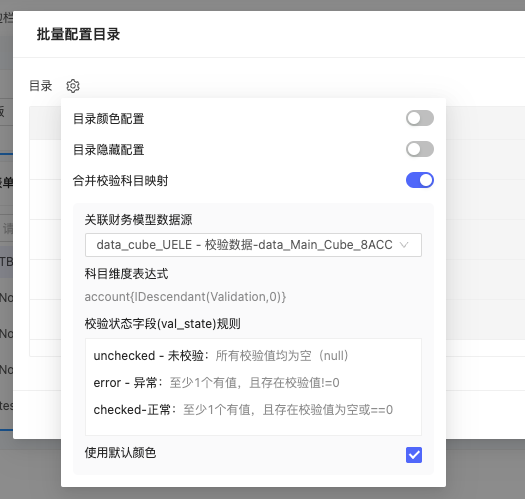 为了满足校验看板数据的展示,以及能够在目录上直观展示校验通过的情况,在套表中增加了校验相关的默认配置,说明如下: