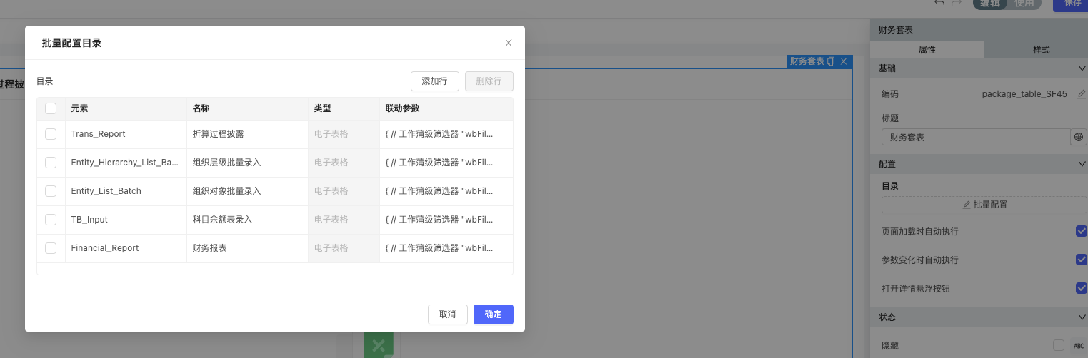3、拖入财务套表,配置目录和联动。