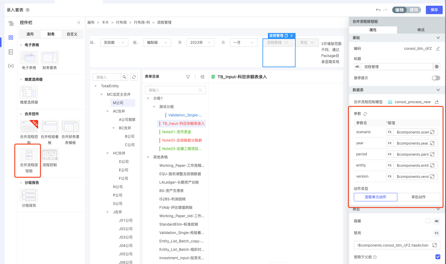 为了便于用户在套表界面也可以进行流程控制与审批,增加了【合并流程控制按钮】。可以通过增加按钮并将参数与筛选器控件值关联的方式,将按钮的状态与动作保持与流程控制界面同维度组合下的一致。