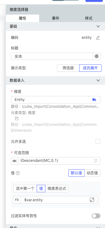 2、拖入维度筛选器,可以选择成员展开。