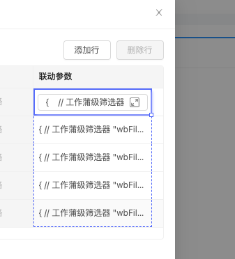 添加后配置联动参数,与UX联动电子表格参数逻辑一样(冒号左边key为电子表格筛选器的编码,右侧为$component.控件编码.value):