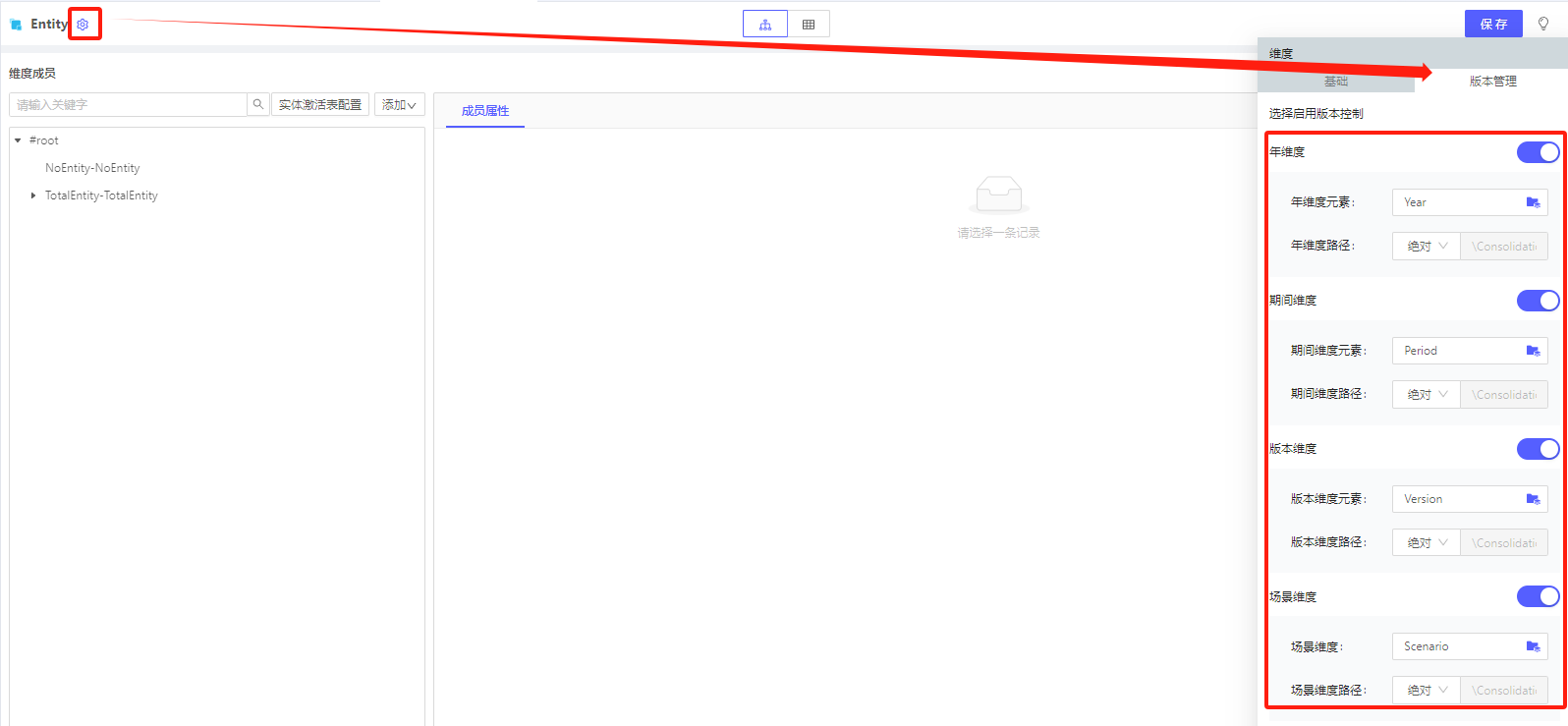 点击多版本实体维度后,点击设置,选择版本管理,设置实体有效性的颗粒度;预置年份``期间``场景