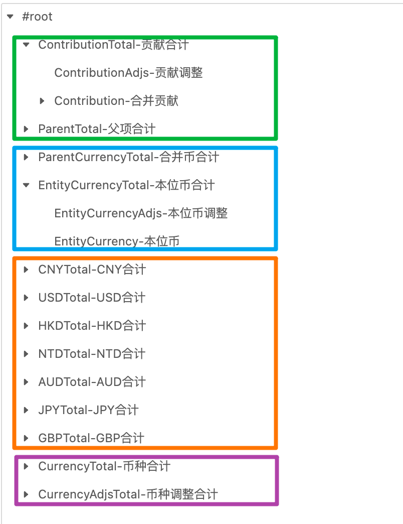 橙色框:根据多版本实体维绑定的本位币维度成员动态生成,每个成员为一棵树
