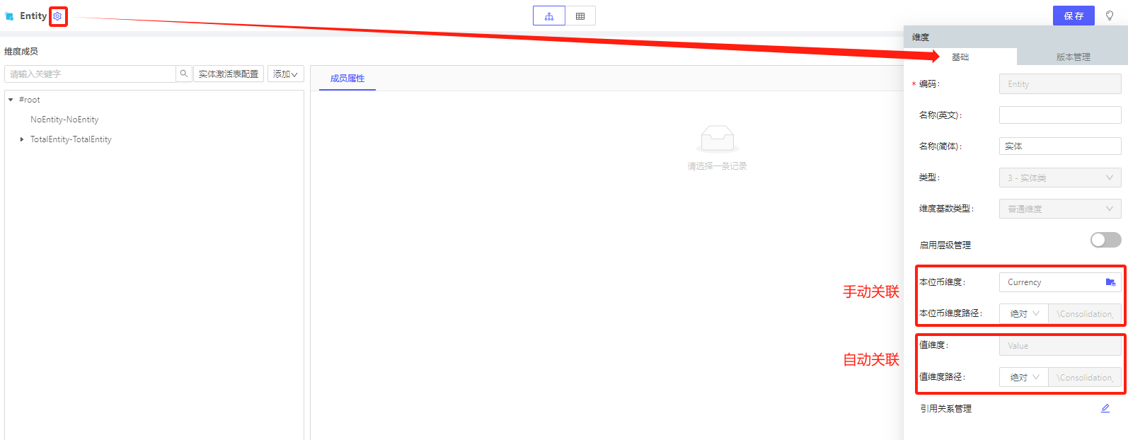 点击多版本实体维度后,点击设置,选择基础,关联本位币维度(通用类)和值维度(值类)