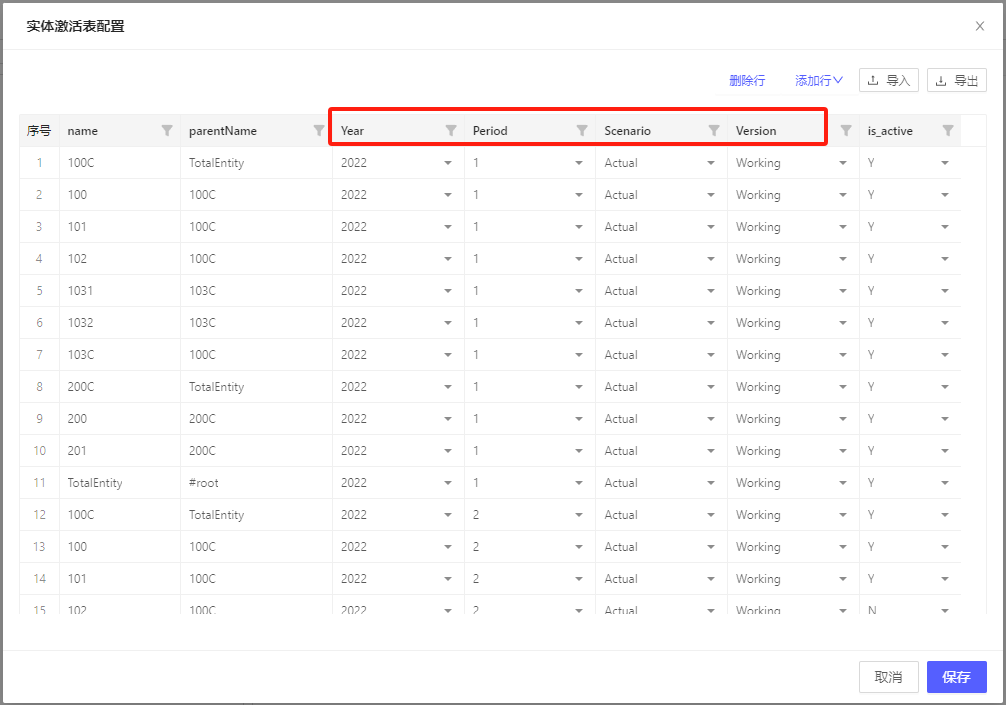 版本管理配置完成后,点击实体激活表配置打开实体有效性清单,上一个步骤开启的维度会出现在配置表里,此外还需要维护层级结构和是否有效的信息