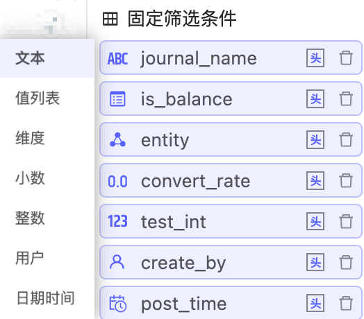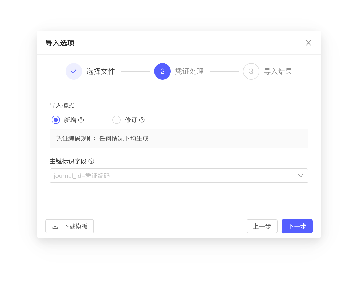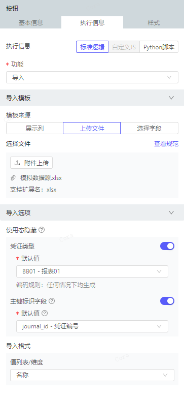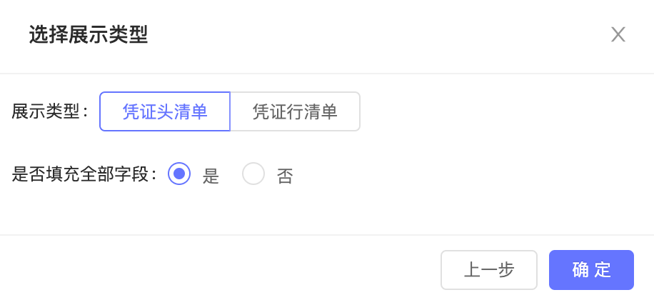 选择字段,支持用户选择凭证头行字段并排序,下载模板时带的样例数据若有维度或值列表字段,下载内容默认为名称(非名称-描述)