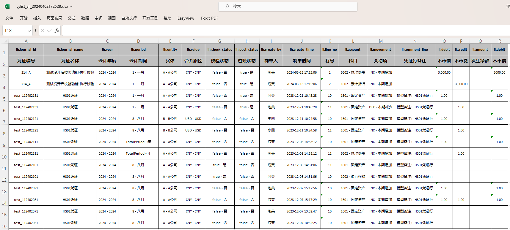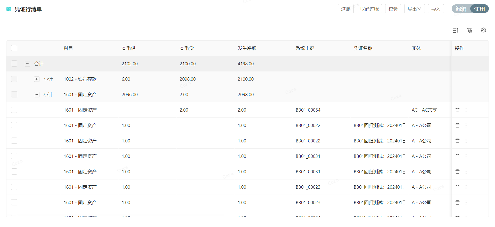 凭证清单以列表形式展示凭证数据,支持凭证头维度,也支持凭证行维度。