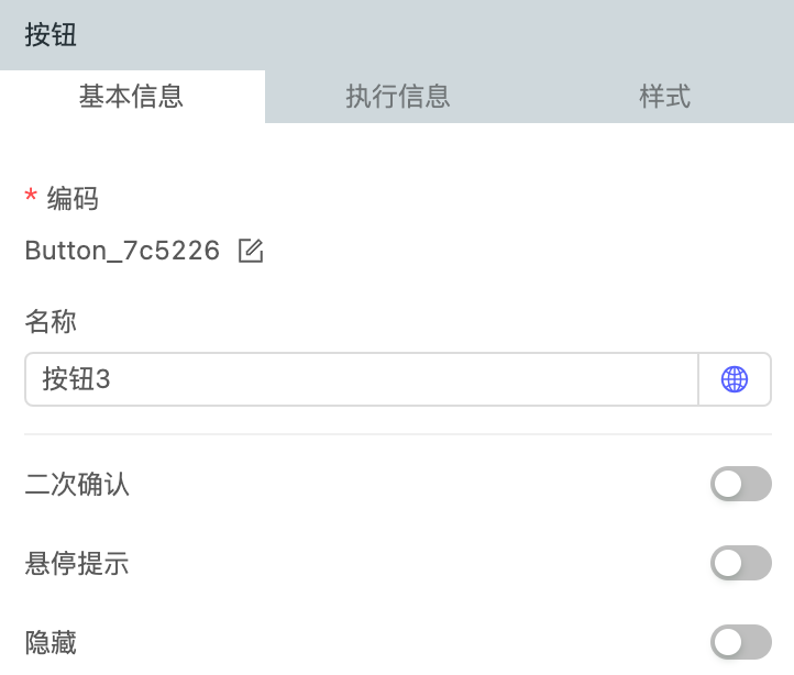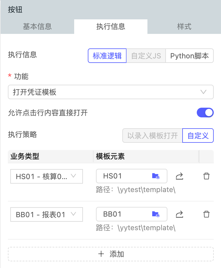 行按钮展示在行数据的操作列中,目前最多添加5个按钮,行按钮支持的标准逻辑包括:打开/过账/取消过账/校验,且执行只针对该行的单条数据