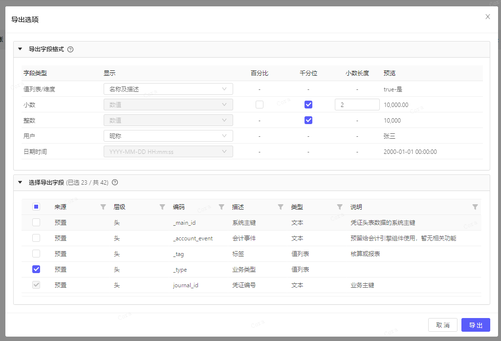 导出的字段范围:默认导出凭证模型的所有字段(除5个系统字段:jh._main_id/jh._account_event/jh._tag/jl._main_id/jl.journal_id)