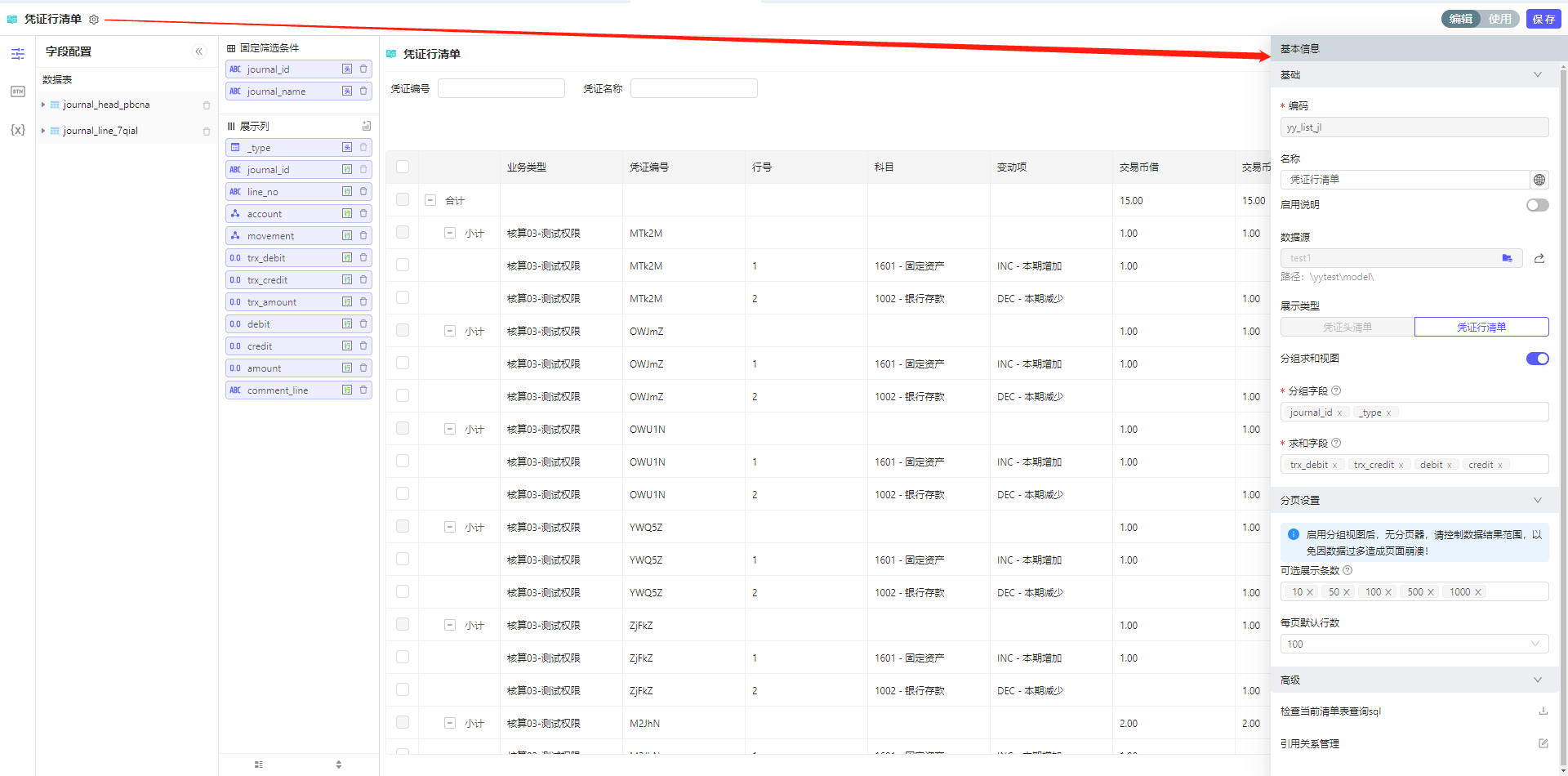 新增:新增新凭证数据,会展示凭证模型上为该凭证类型配置的凭证编码规则,如果启用了自动编码,则journal_id字段可以为空,并可选择其他凭证头字段作为主键标识字段,用于标识哪些凭证行属于同一条凭证