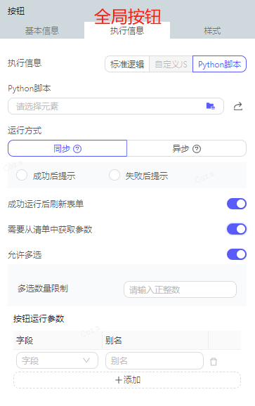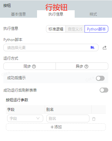 如果需要从查询的清单中获取参数,则需要启用需要从清单中获取参数,并配置按钮运行参数,可选固定筛选条件和展示列字段: