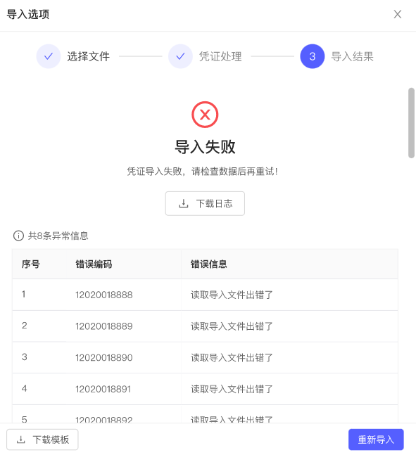 导入失败:只要文件内有凭证导入失败,则整批凭证全部导入失败,导入页面会展示全部的错误信息