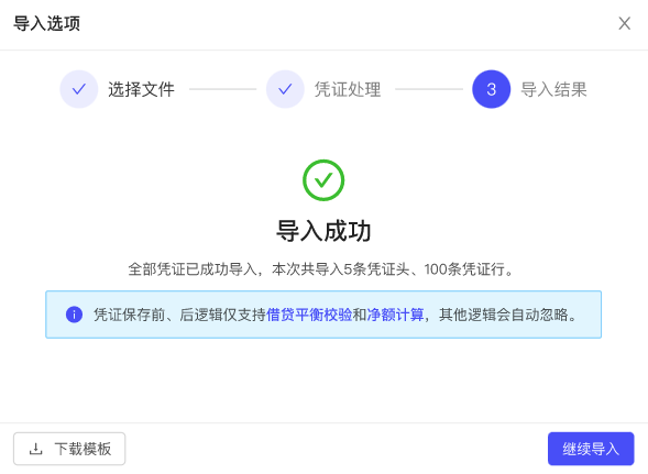 导入成功:导入会依次进行数据填充(默认值、预置规则)、保存前后置逻辑(仅支持借贷平衡校验和净额计算)