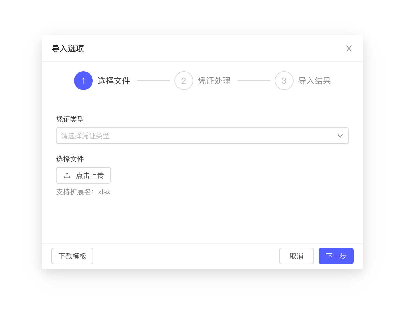 选择本次要上传的凭证属于哪个类型,单次只能导入同一种凭证类型的数据,并选择需要导入的本地文件,仅支持xlsx格式文件