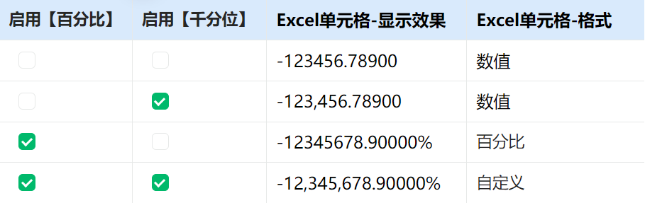 对数值格式的特别说明:Excel中的单元格格式还会根据是否启用百分比和千分位来决定,效果如下图,但导出的数据都能进行数学计算(比如求和)。