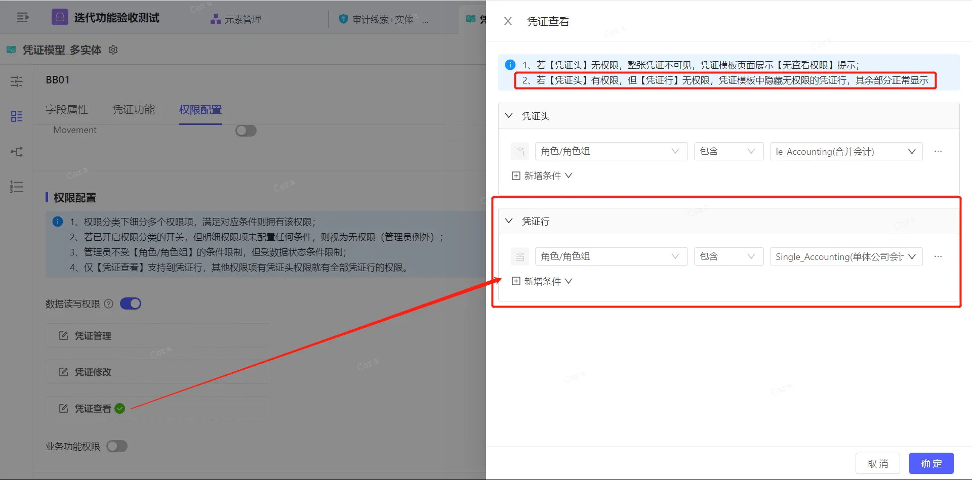 2. 开启数据读写权限,`凭证查看`中为【凭证行】配置条件