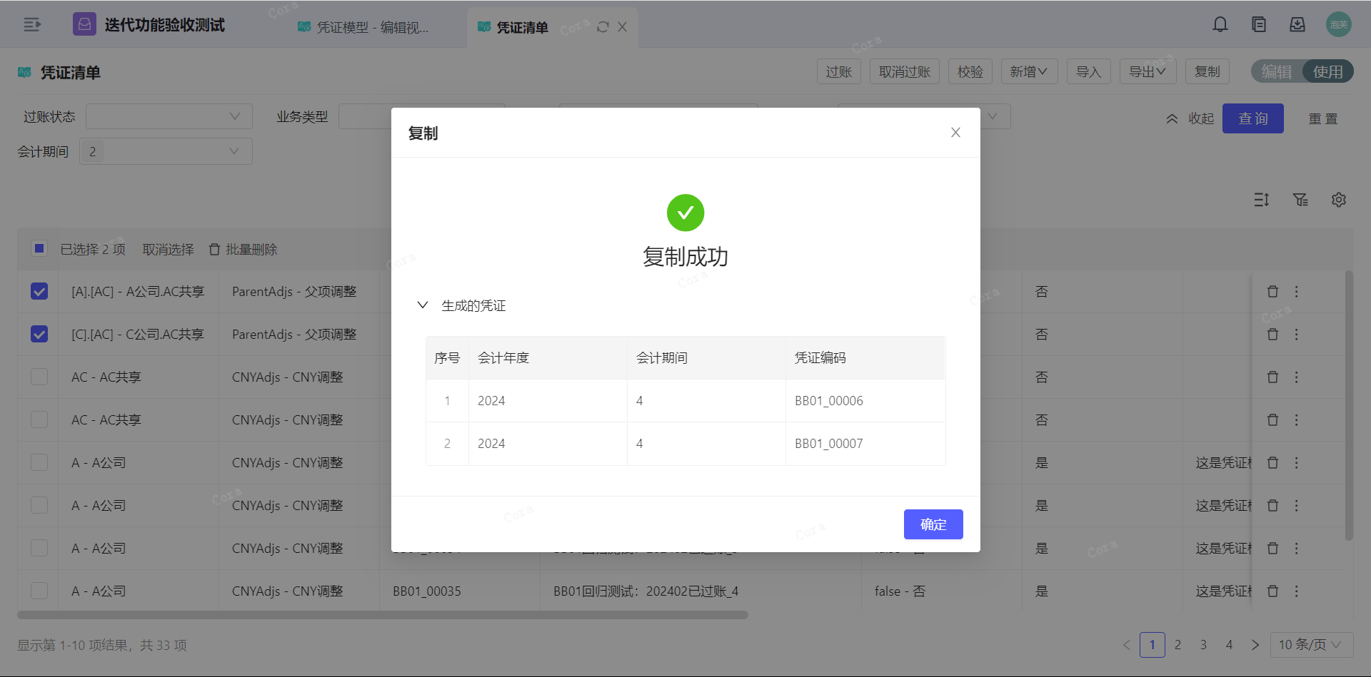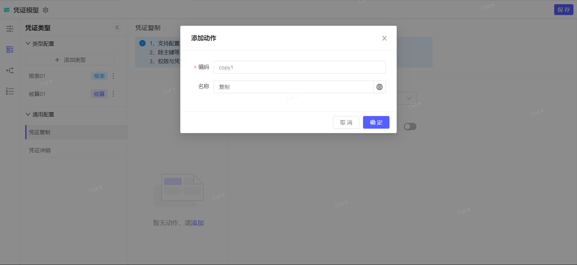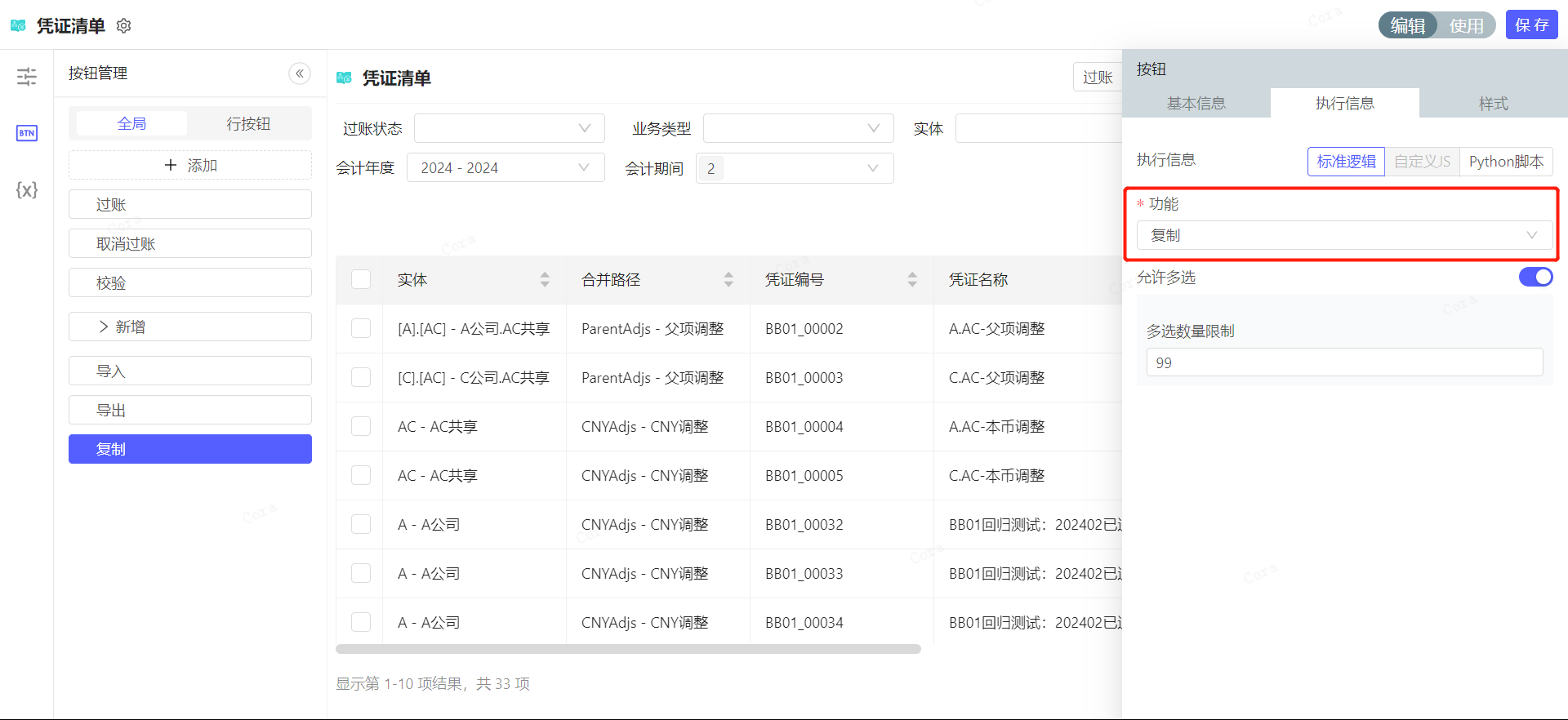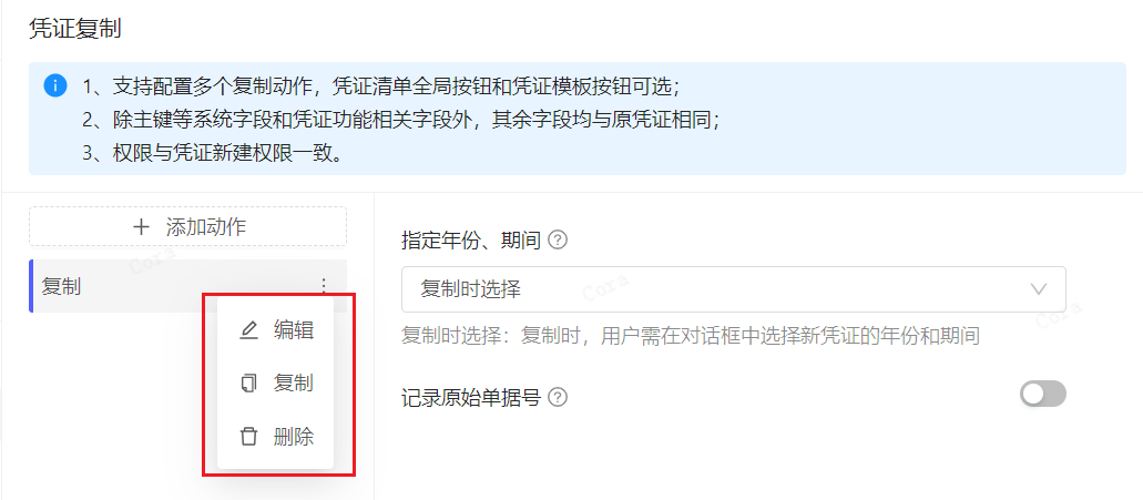 1、支持配置多个复制动作,凭证清单全局按钮和凭证模板按钮可选;