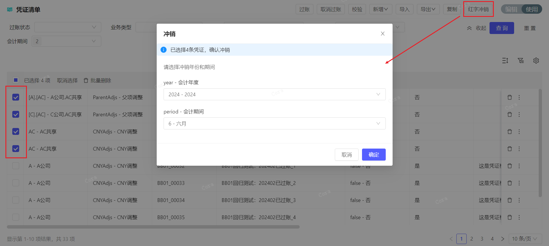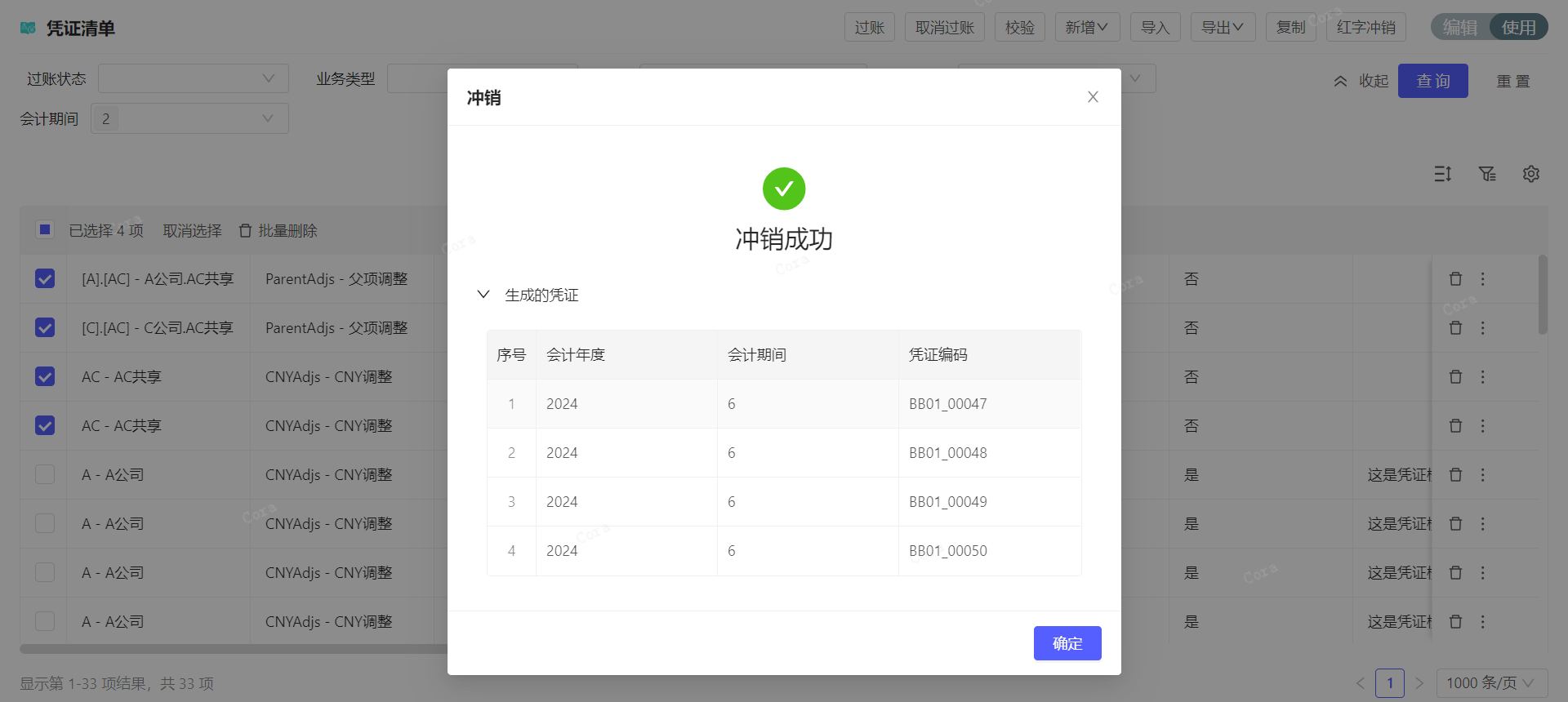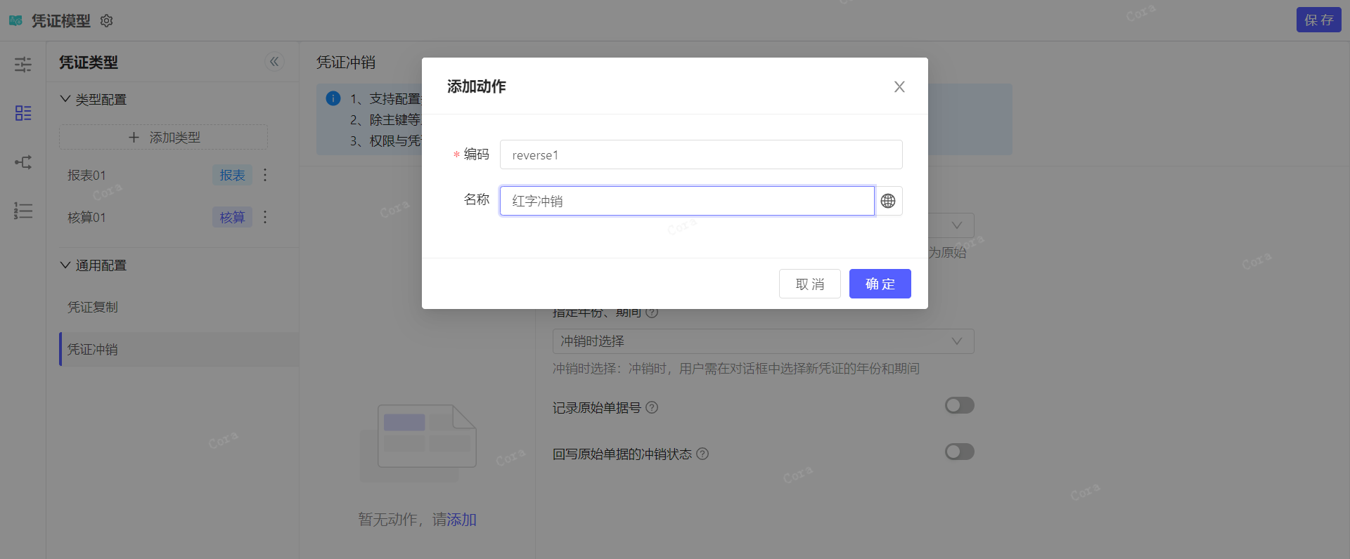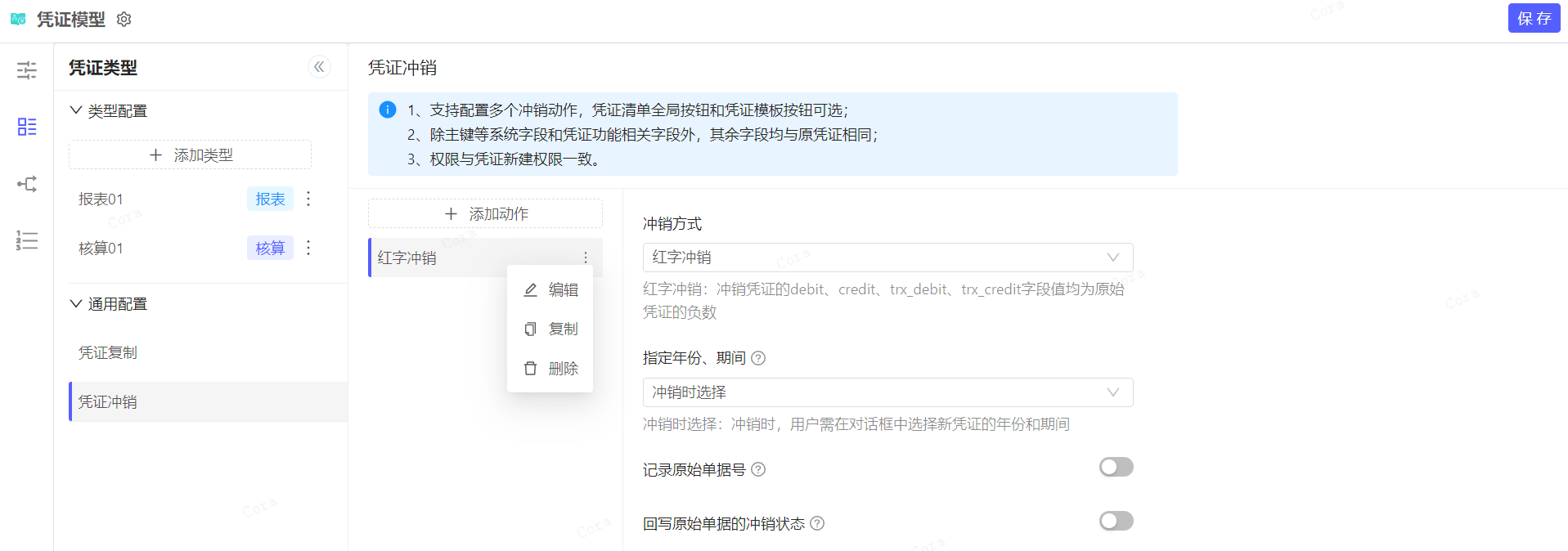 1、支持配置多个冲销动作,凭证清单全局按钮和凭证模板按钮可选;