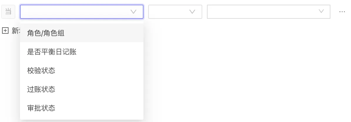 嵌套筛选条件【凭证查看】权限支持在凭证头条件的基础上,细化到【凭证行】,其他的只要有凭证头权限就有全部凭证行的权限,如果不配置凭证行的条件,则不会对凭证行额外控制权限,即只要有头权限就有全部行权限。
