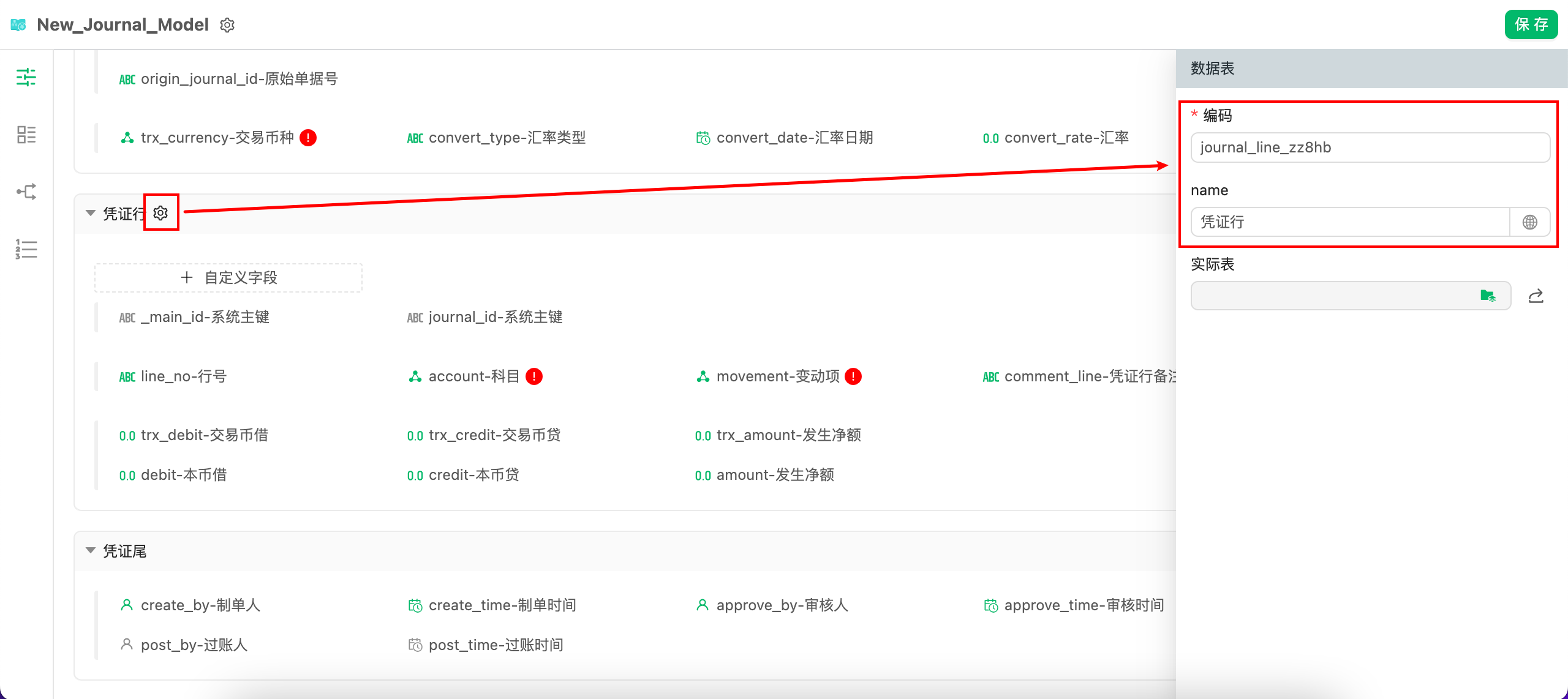 点开凭证头和凭证行旁边的设置icon可以配置数据表编码和名称信息