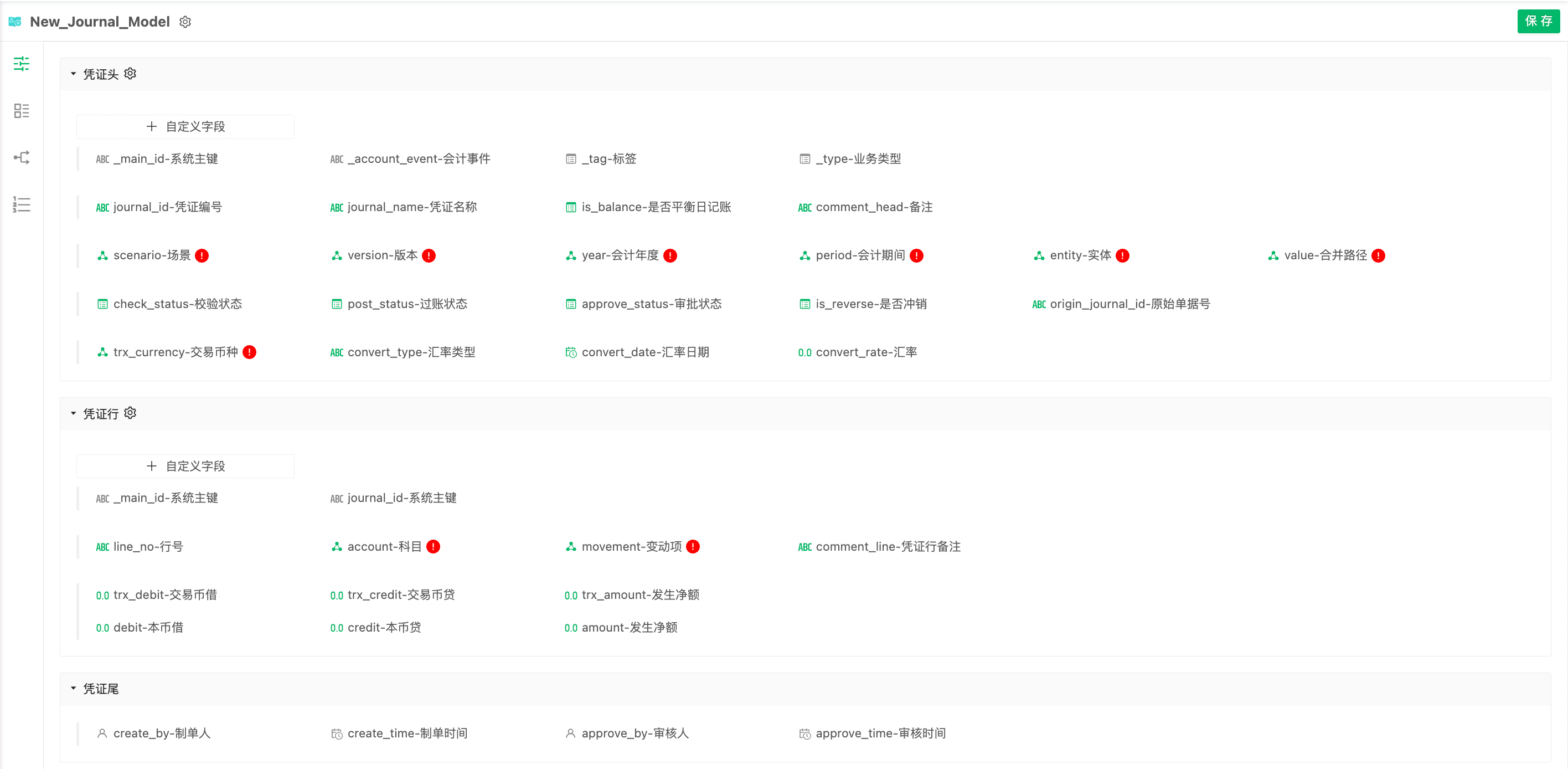第一个tab叫『字段配置』,在此处可以看到凭证模型为预置的头行结构1:N的两张表,凭证头和凭证尾区域的字段来自头表,凭证行区域的字段来自行表
