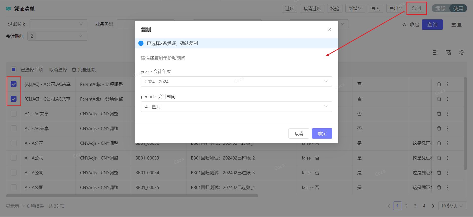复制时,用户需在对话框中选择新凭证的年份和期间,用以指定新凭证的 |