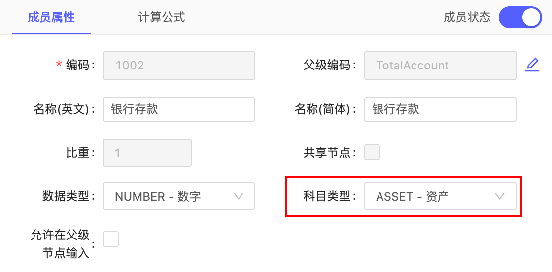 科目类型说明:凭证行字段account-科目关联的维度元素,其维度成员的科目类型属性