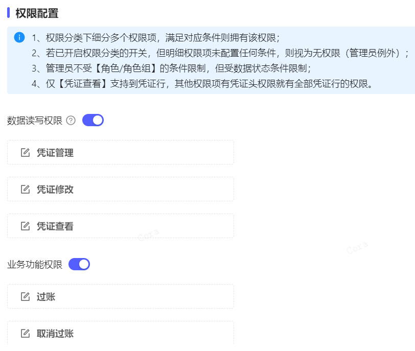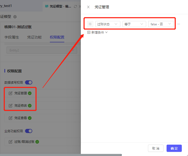 1. 开启数据读写权限,`凭证管理`和`凭证修改`权限的条件是`过账状态=否`