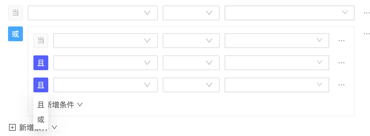 条件间关系支持且和或,同一层级的条件间关系只能都是且或都是或