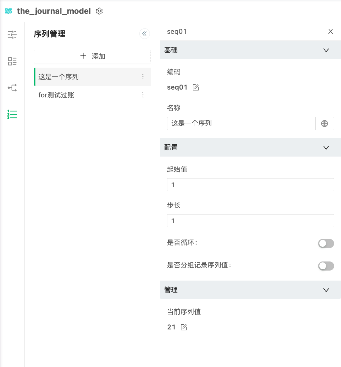 是否分组记录序列值:可以选择凭证头和凭证行的字段,如分组字段为Entity,则按Entity的成员有自己的序列值,比如A-1;B-10,每个成员独自计数