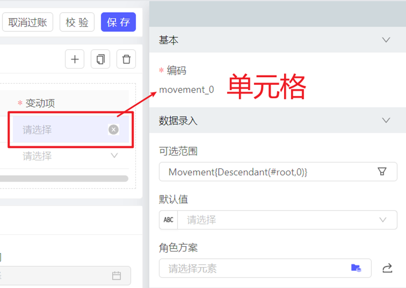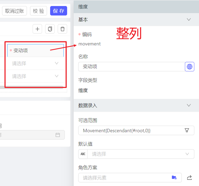 针对凭证行字段(表格列),可设置整列字段的可选范围和默认值,但可以被单元格配置覆写
