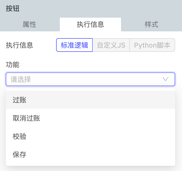 左侧第一个tab页为按钮配置,可添加自定义按钮,执行信息目前仅支持标准逻辑:过账/取消过账/校验/保存