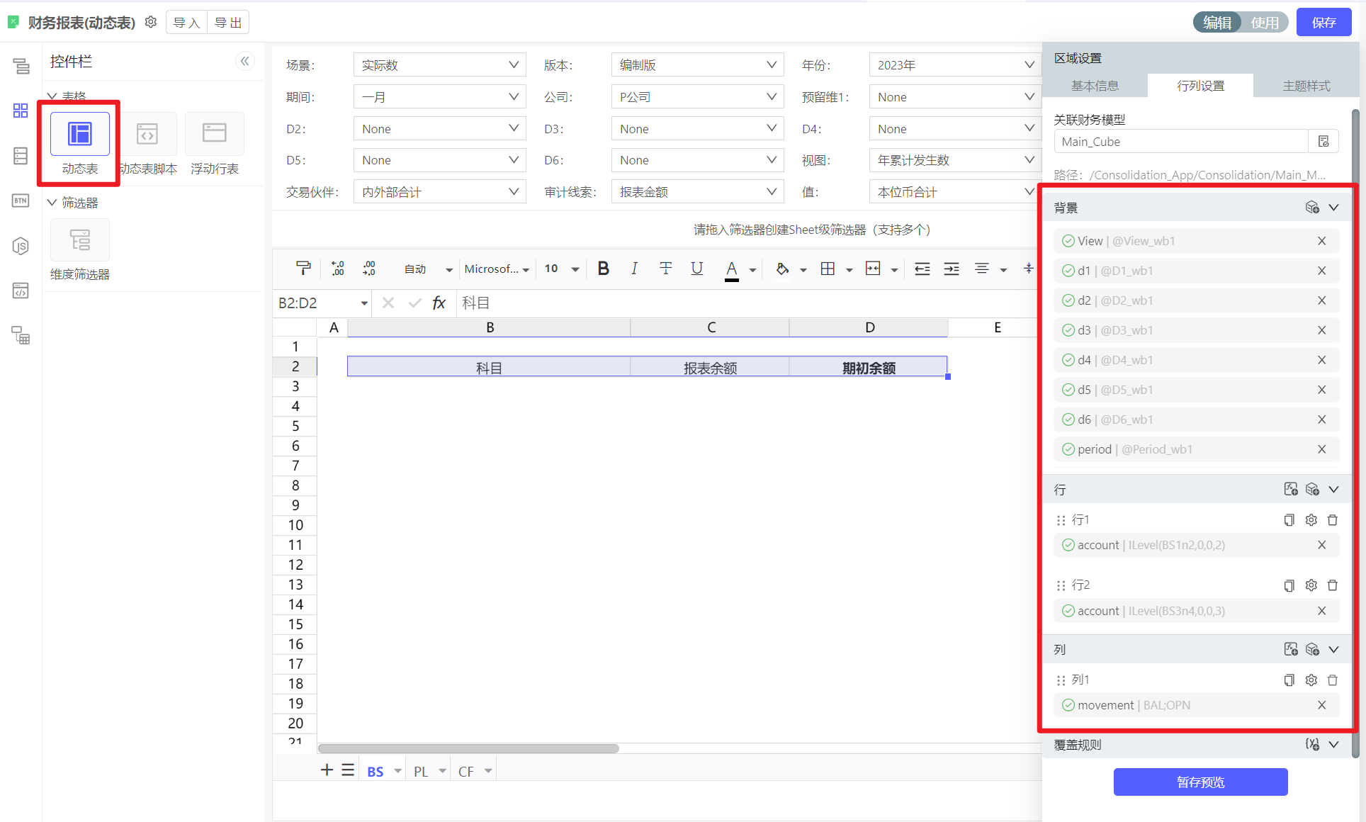 先胜云的动态表,是财务模型中数据展示最常用的工具,它以财务模型为数据源,通过对背景,行,列上维度和维度成员的设定而形成可以查看和填报的报表。通过维度成员设定,在数据透视表中的每一个单元格都对应一组维度成员的组合,用这个组合就可以从财务模型中定位到一个具体的查询视角,进而将其数据取出。