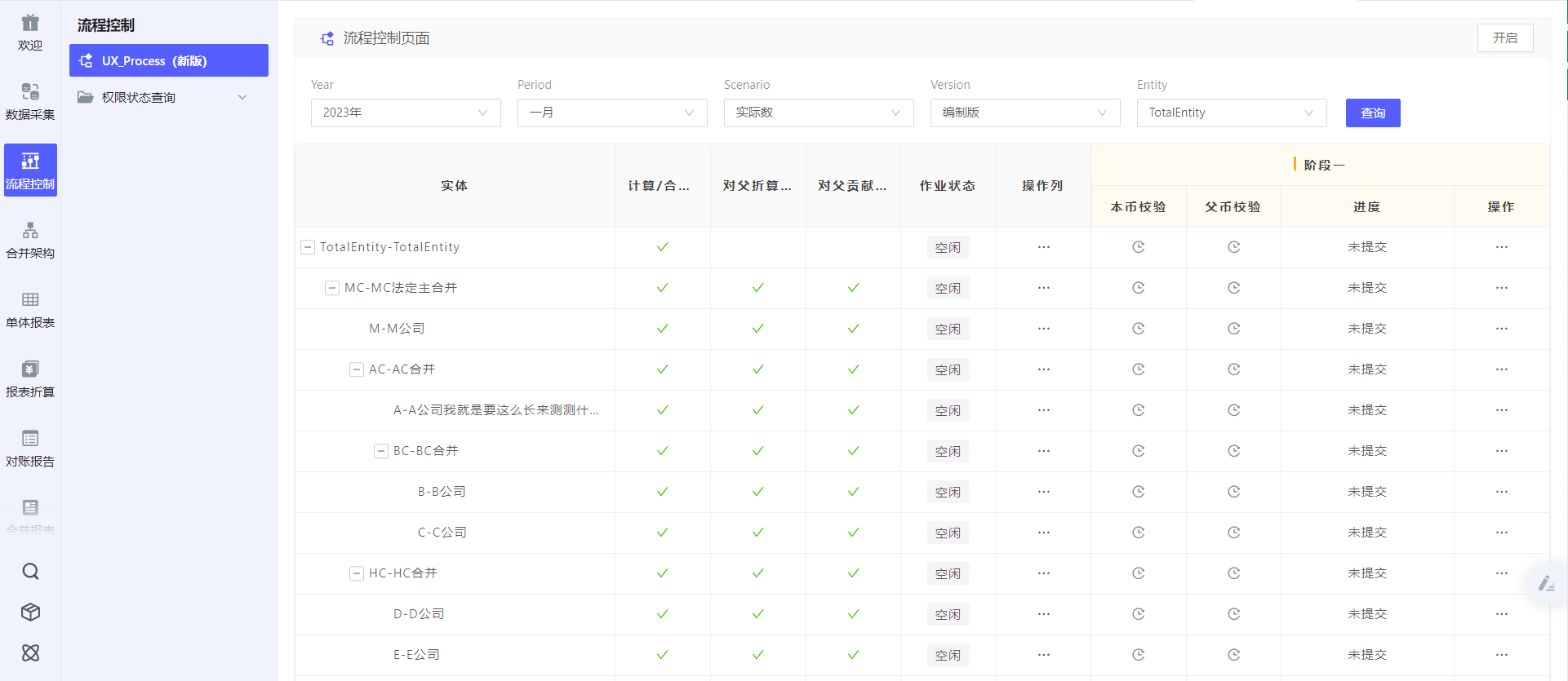 实现方案:在合并流程中,通过点击合并执行相关按钮,系统自动计算相关校验指标并存入财务模型中,同时在执行相关按钮逻辑后自动展示校验结果