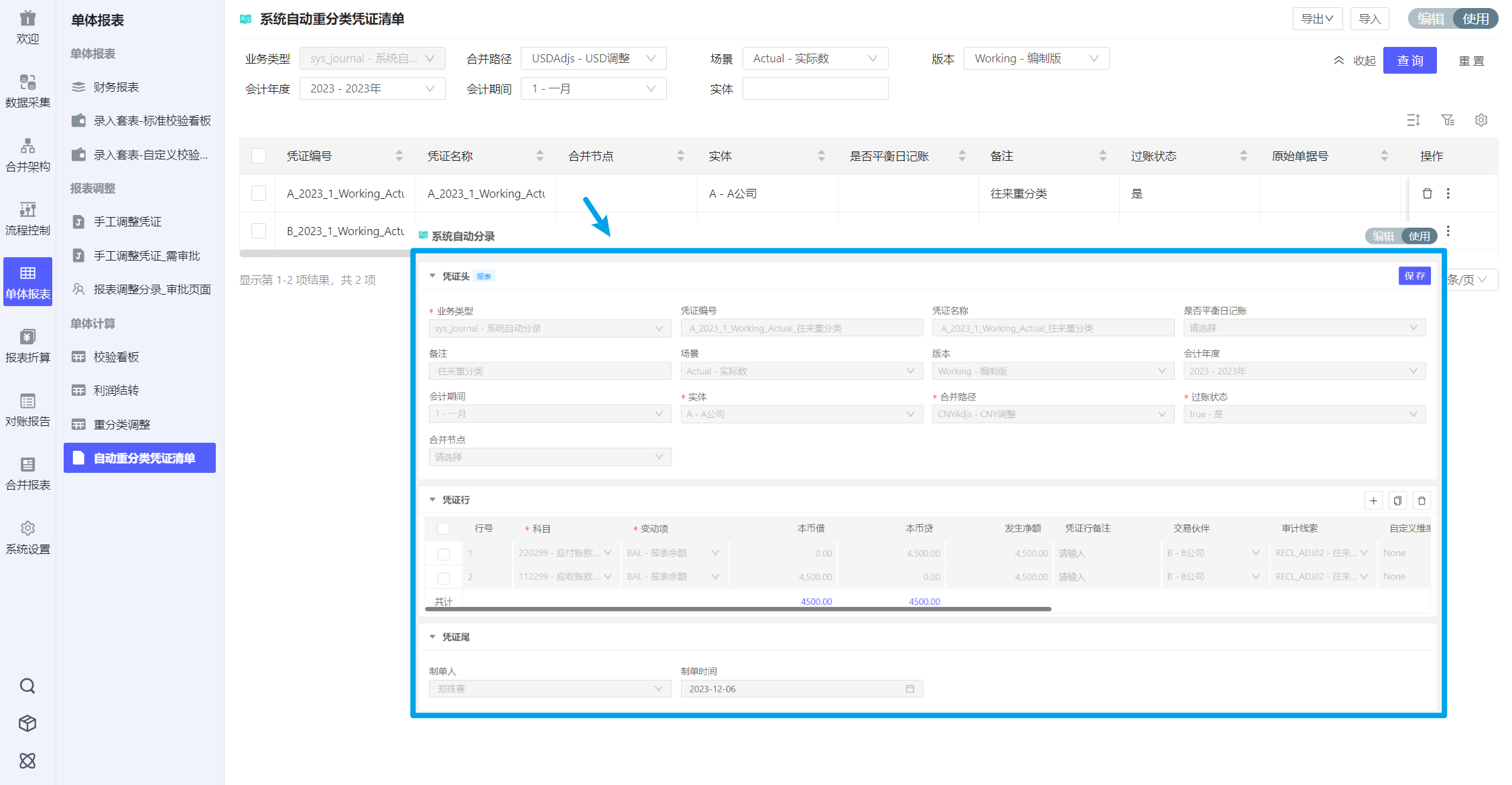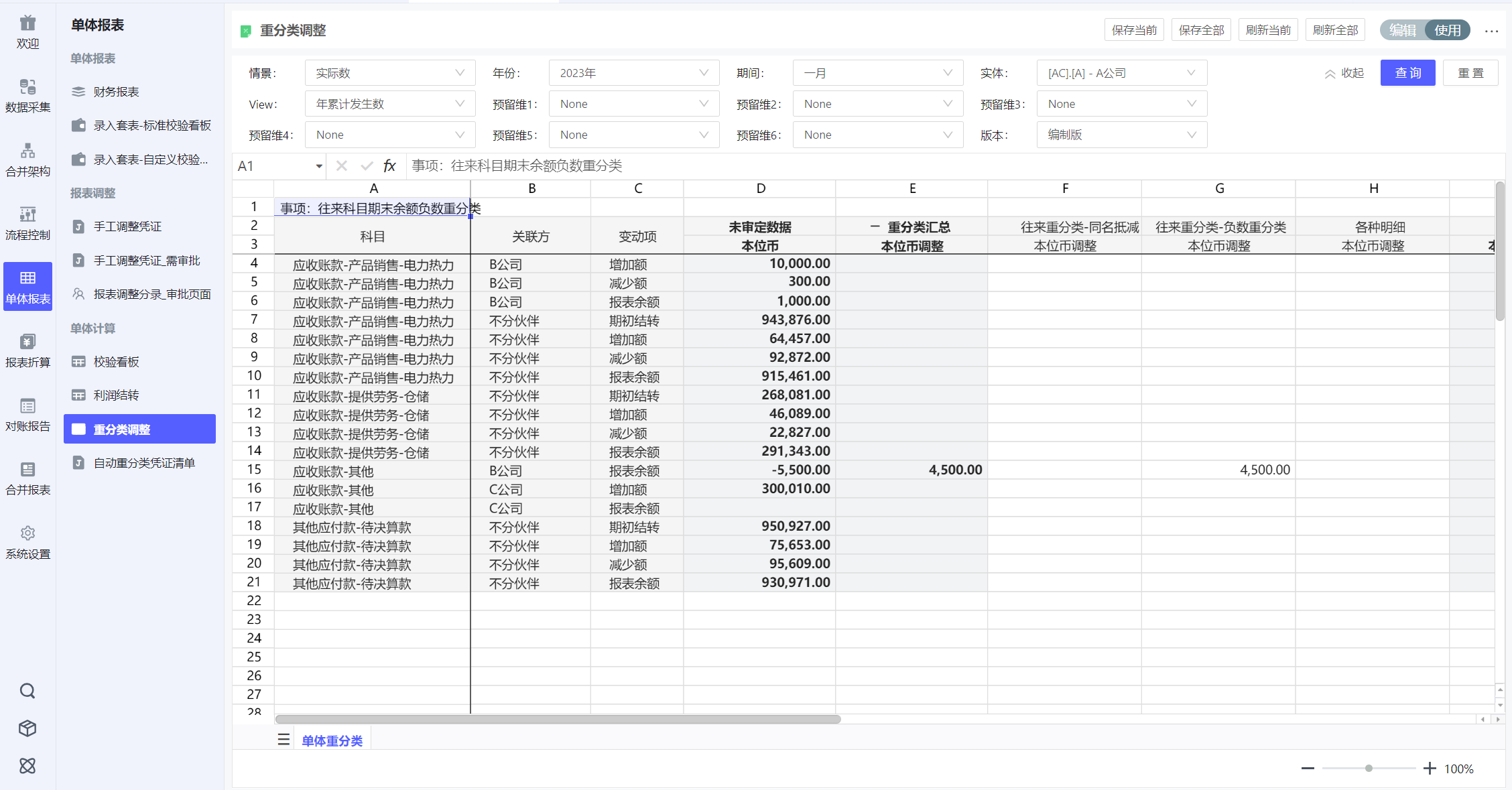 重分类计算可由合并算法实现,计算时,可同时生成重分类数据到财务模型 及 重分类调整凭证到凭证模型。方便数据从财务模型追溯到明细。