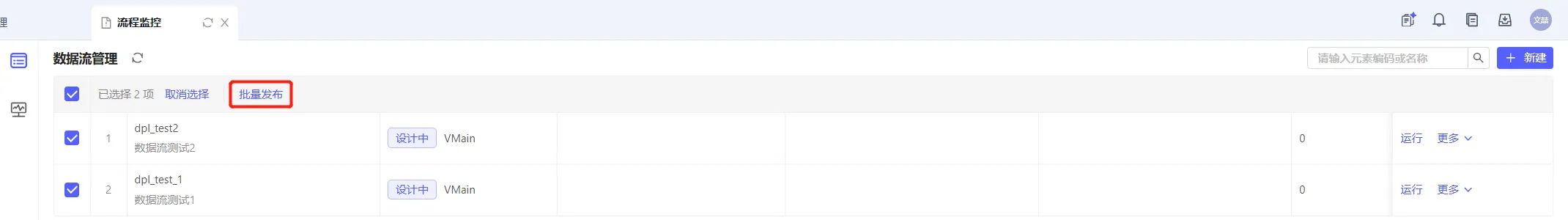 目标应用进入流程监控,批量发布数据流
